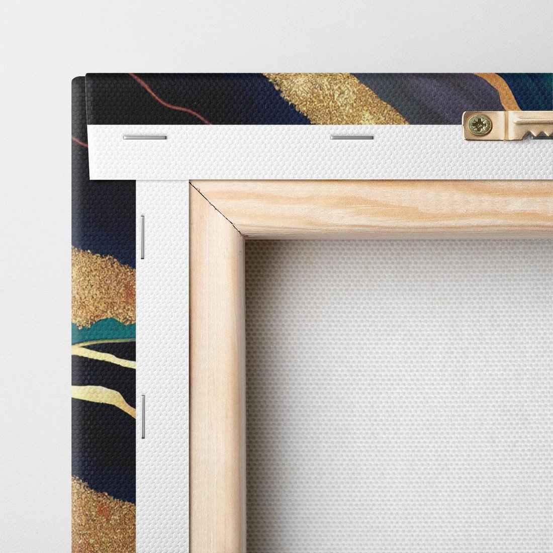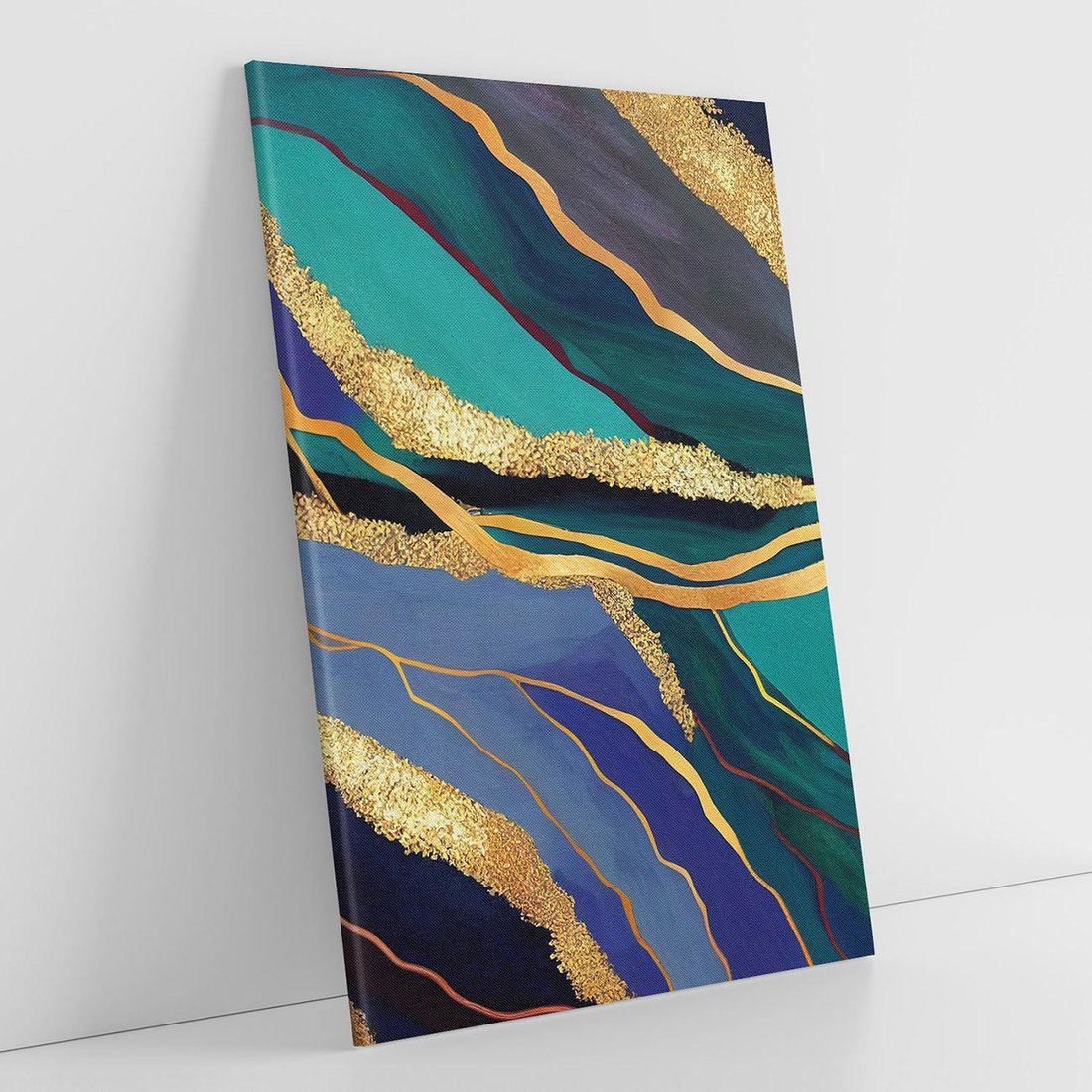 Zachwycaj się abstrakcyjną grafiką inspirowaną marmurem, wzbogaconą o intensywne kolory złota, zieleni i granatu. To wyjątkowe dzieło sztuki, stworzone dla osób ceniących elegancję i nowoczesność. Obraz emanuje luksusowym wdziękiem i będzie doskonałą dekoracją dla miłośników sztuki, pragnących unikalnego akcentu w swoich wnętrzach.