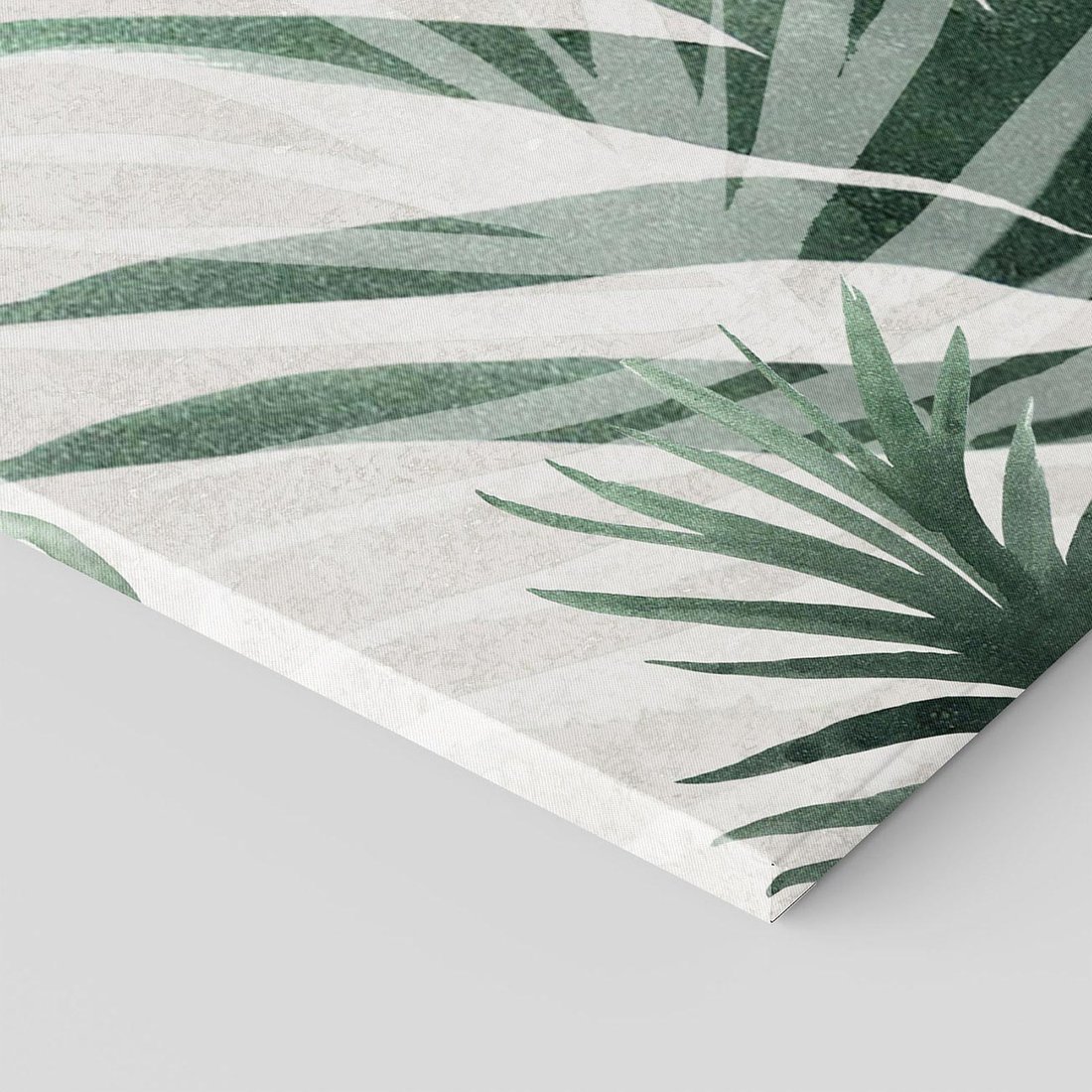 Akwarelowa kompozycja przedstawia tropikalne liście palm i monster. Delikatne odcienie zieleni kontrastują z beżowym tłem, tworząc harmonijną całość. Obraz emanuje świeżością natury i subtelnym urokiem, idealny do dekoracji wnętrz, które pragną zachować tropikalny klimat i artystyczny wdzięk.