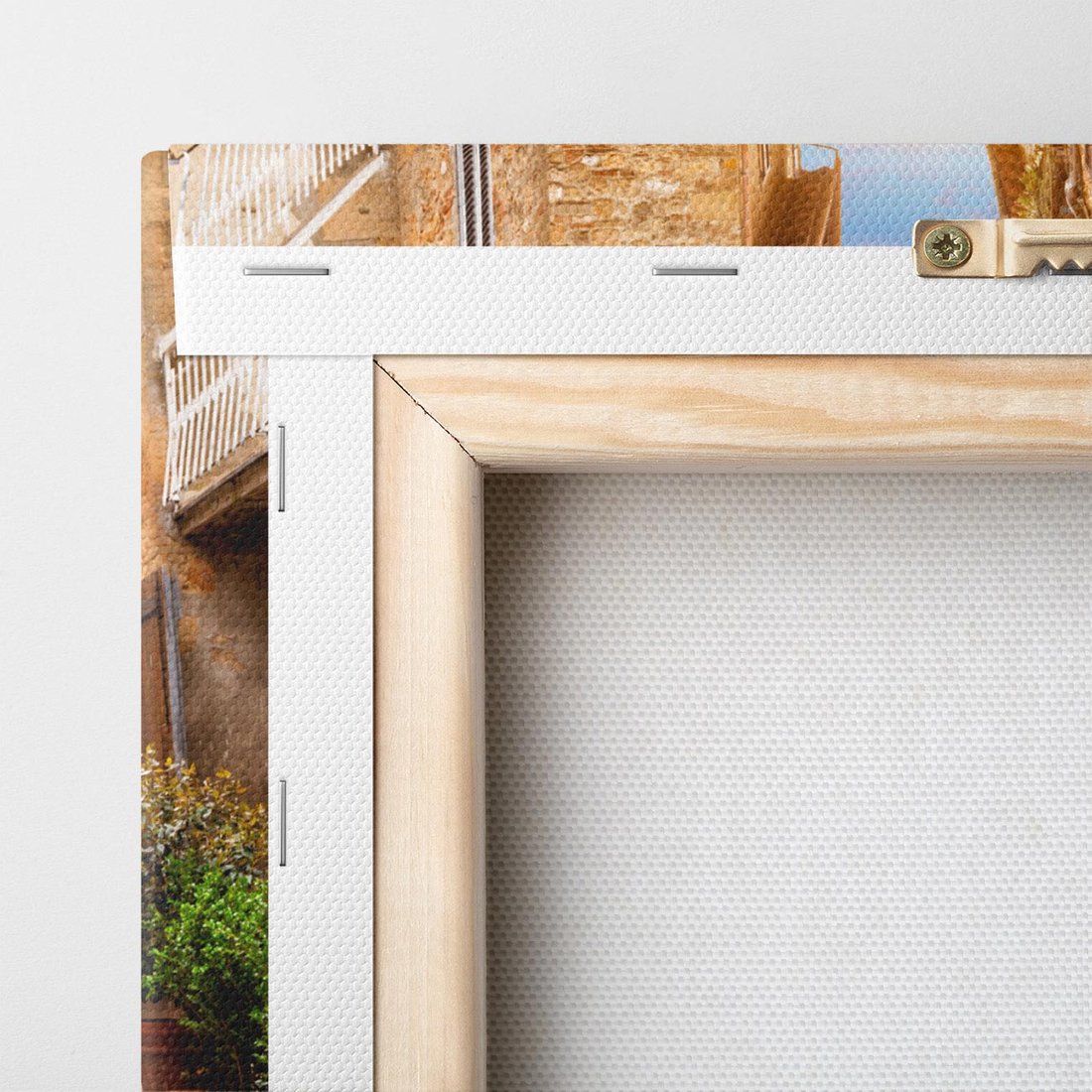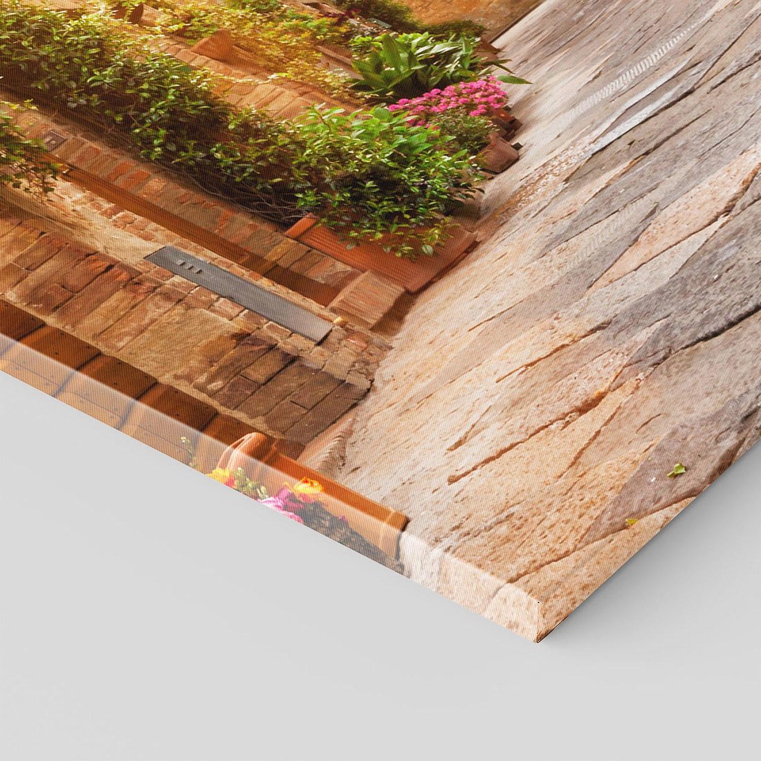 Ożyw swoje wnętrze tym uroczym obrazem przedstawiającym urokliwą uliczkę miasta wypełnioną kolorowymi kwiatami. Kamienne mury, malownicze balkony i romantyczna atmosfera tworzą nastrojową aurę. Ten obraz dodaje uroku miejskiego krajobrazu i naturalnego piękna kwiatów, idealny dla miłośników malowniczych miast i harmonii natury.