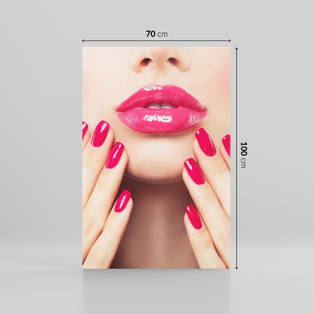 Ten stylowy obraz przedstawiający paznokcie, usta i makijaż wprowadzi do Twojego wnętrza wyrażenie piękna i indywidualności. Ciesz się subtelnością detali i dodaj wyrazistości do swojego wnętrza.