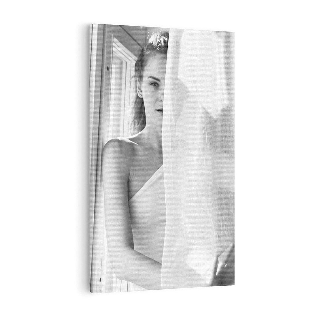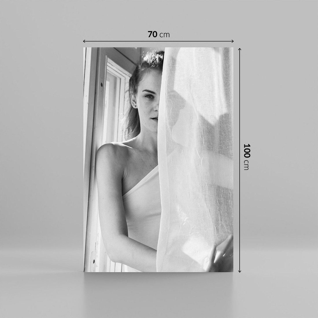 Obraz na płótnie 70x100 - Za Firanką - czarno białe zdjecie, piękny portret eterycznej kobiety