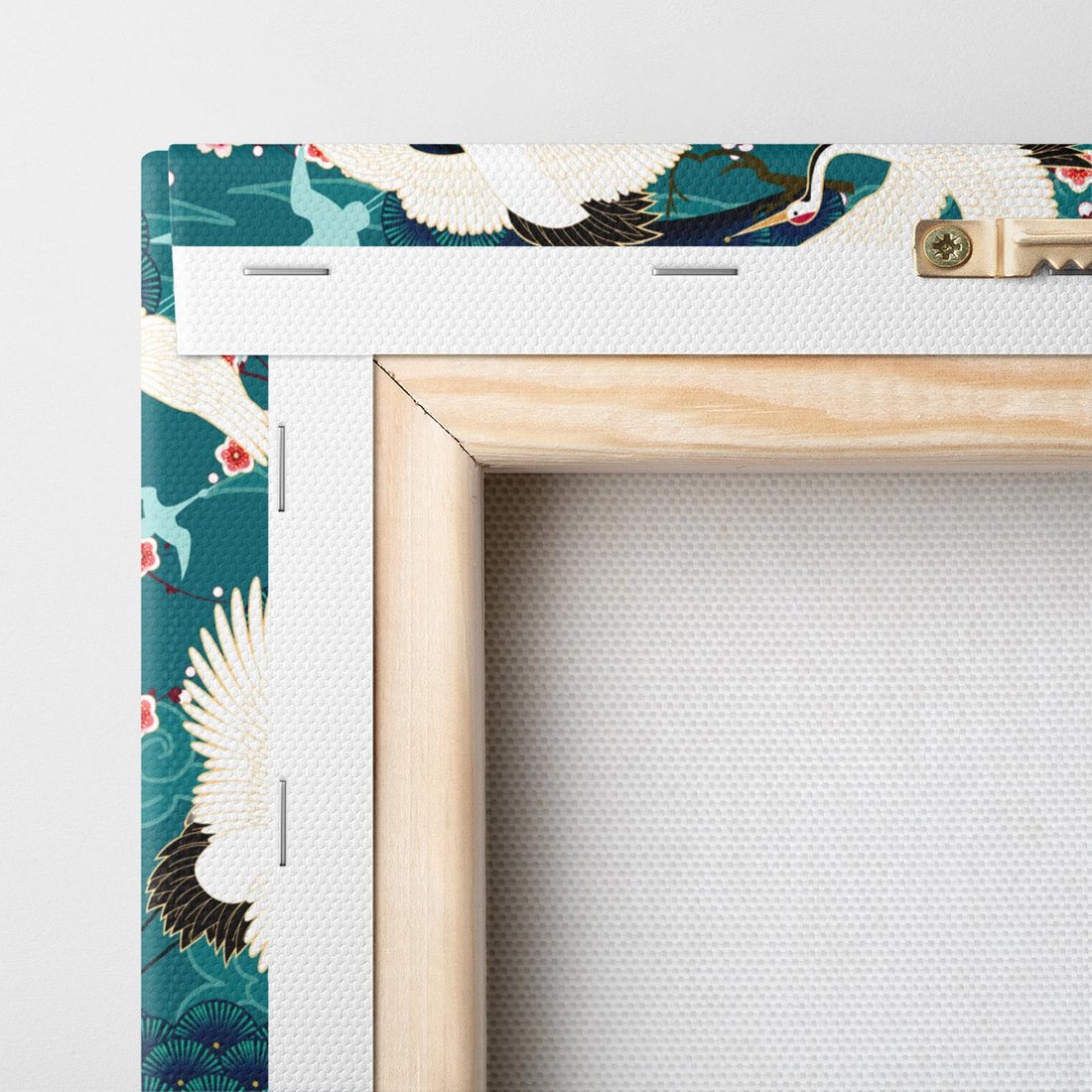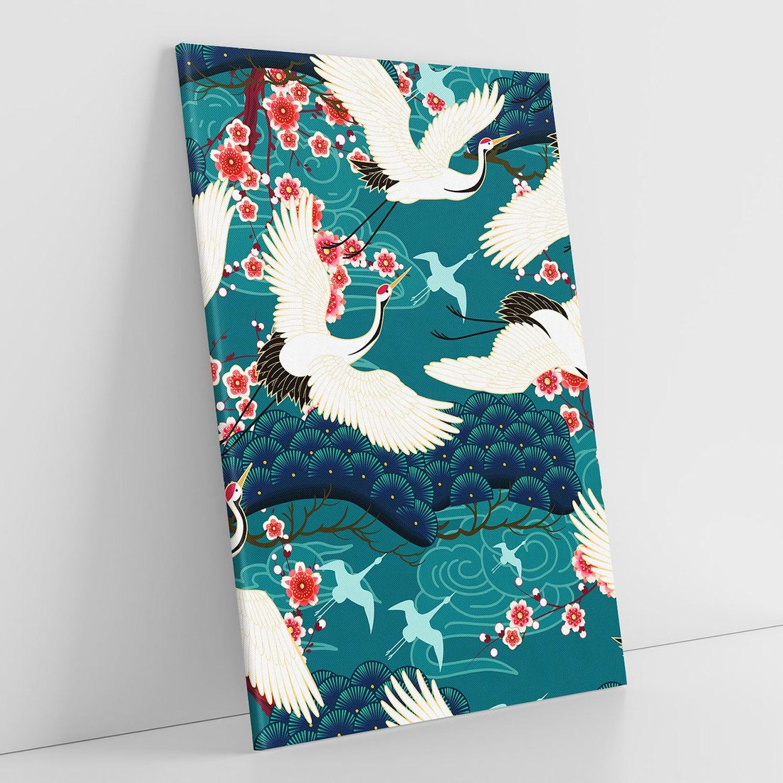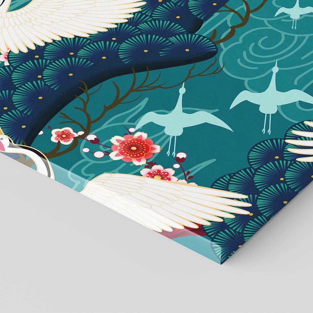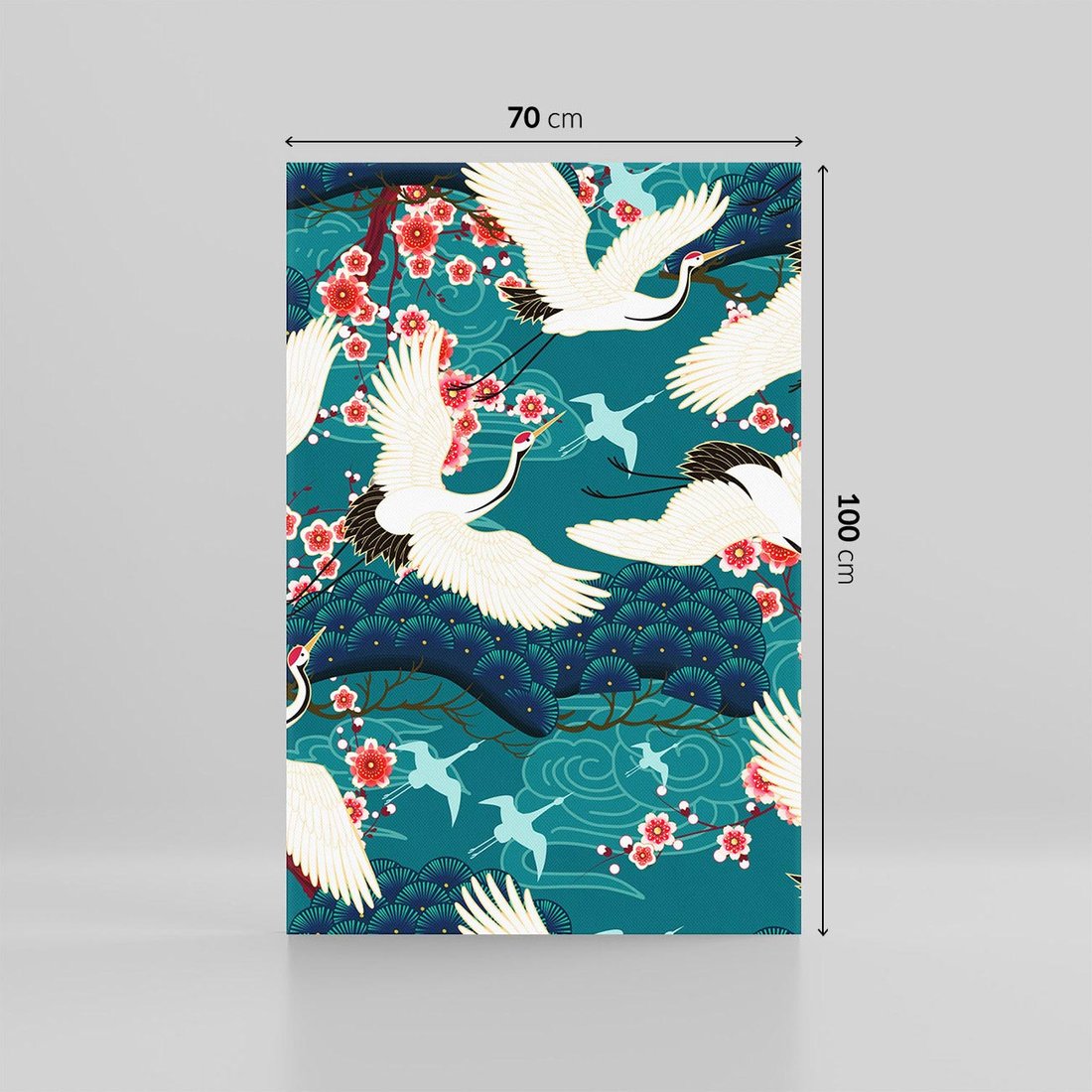 Grafika przedstawia orientalne japońskie żurawie lecące na turkusowym tle, w otoczeniu delikatnych kwiatów wiśni. Kształty wachlarzy dodają kompozycji elegancji. To artystyczne dzieło niesie ze sobą odrobinę dalekich kultur, przynosząc spokój i subtelny urok do wnętrza. Doskonałe do dekoracji w każdej przestrzeni.