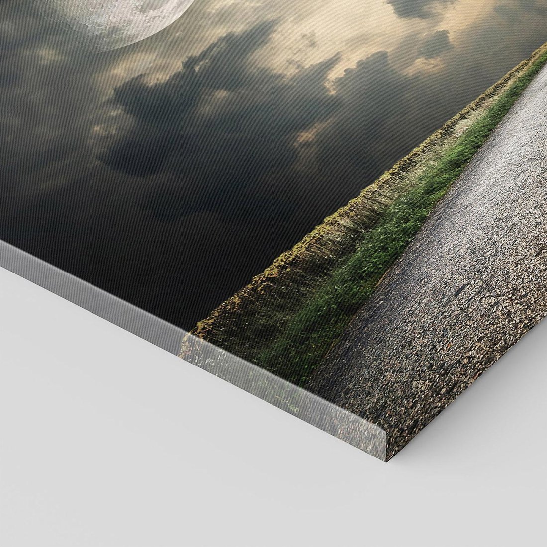 Przenieś się w magiczną podróż dzięki temu uroczemu obrazowi przedstawiającemu księżyc nad drogą. Mroczna sceneria, migoczące gwiazdy i blask księżyca tworzą niezwykły klimat. Ta kompozycja dodaje tajemnicy i wyobraźni, idealna dla miłośników nocnych pejzaży i chwili refleksji pod księżycem.