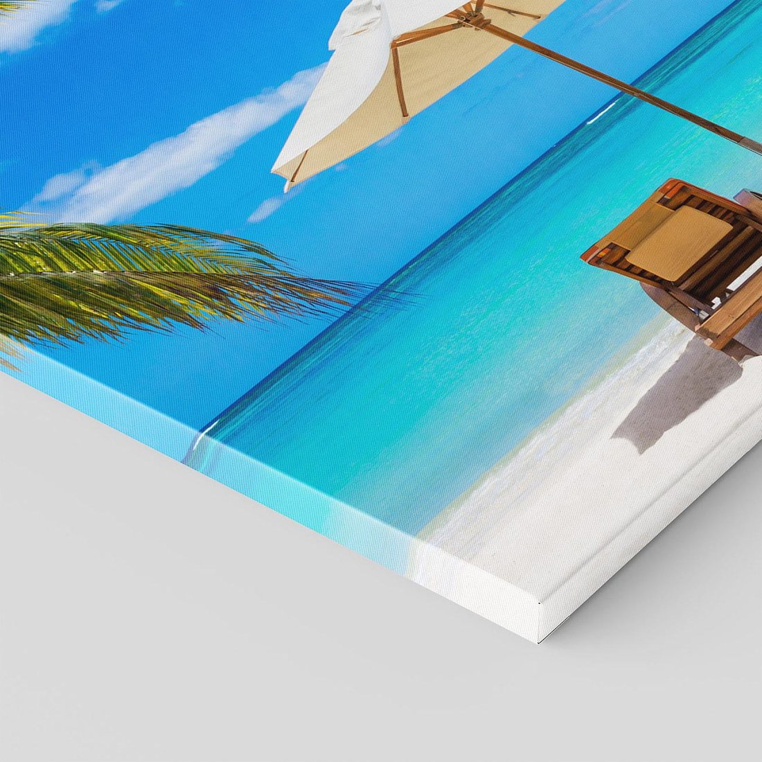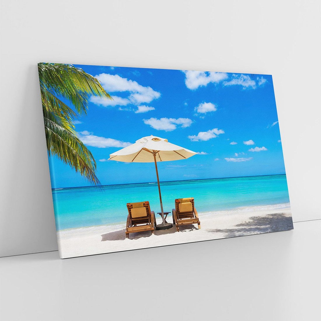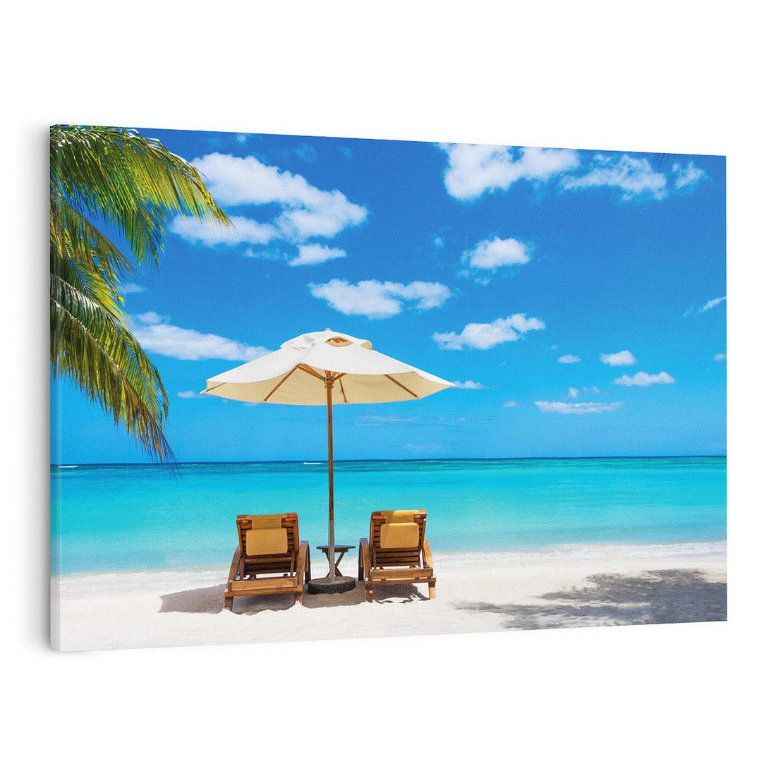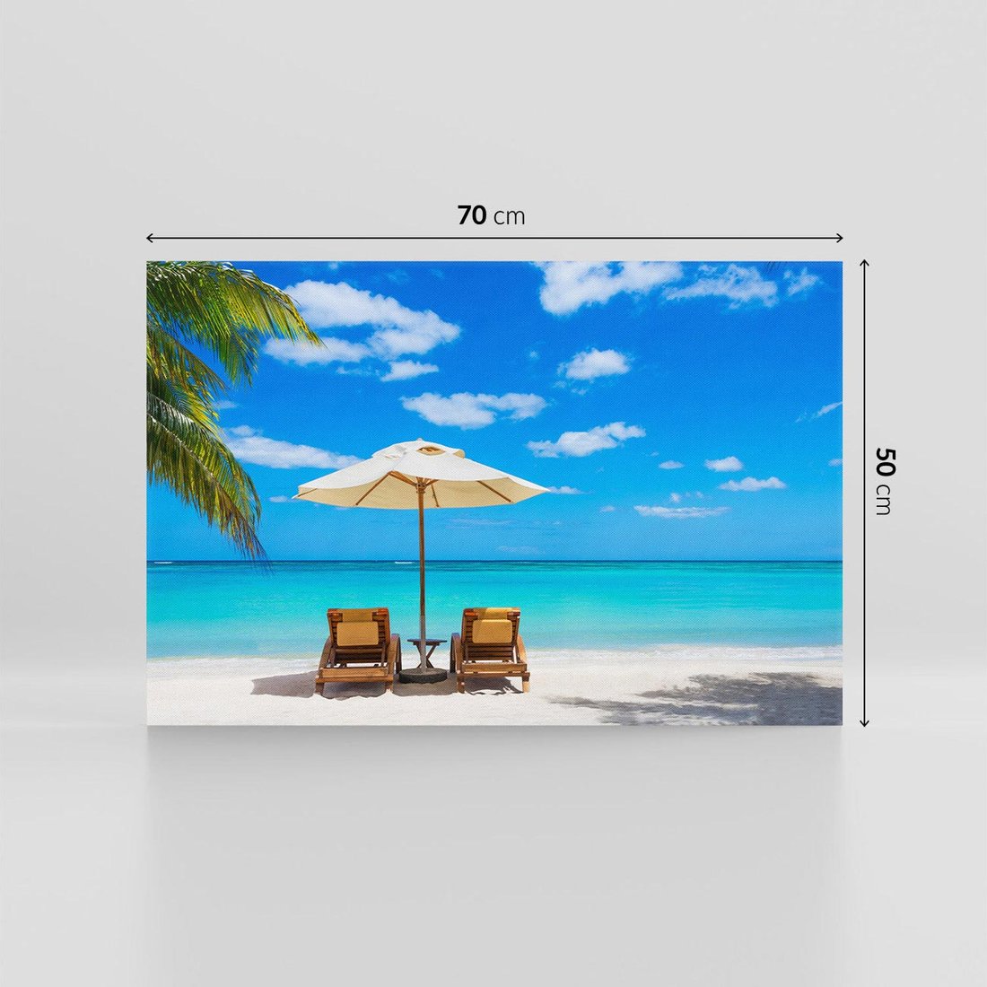 Przenieś się na egzotyczną plażę dzięki temu ujmującemu obrazowi na płótnie. Palma i kolorowe parasole nadają tropikalny klimat, a piasek i turkusowa woda dodają spokoju i świeżości. Dodaj odrobinę raju do swojego wnętrza.