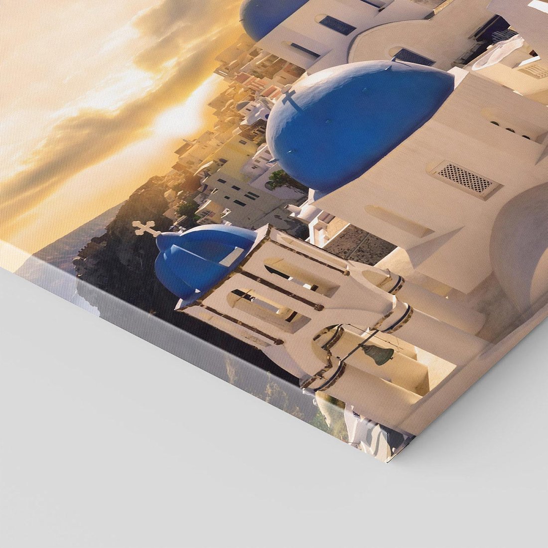 Odkryj urok malowniczej Santorini dzięki temu uroczemu obrazowi przedstawiającemu to greckie miejsce. Błękitne dachy, białe domy i niebiańskie widoki tworzą romantyczną atmosferę. Ta kompozycja dodaje uroku i greckiego stylu, idealna dla miłośników błękitnych odcieni i śródziemnomorskiego klimatu.