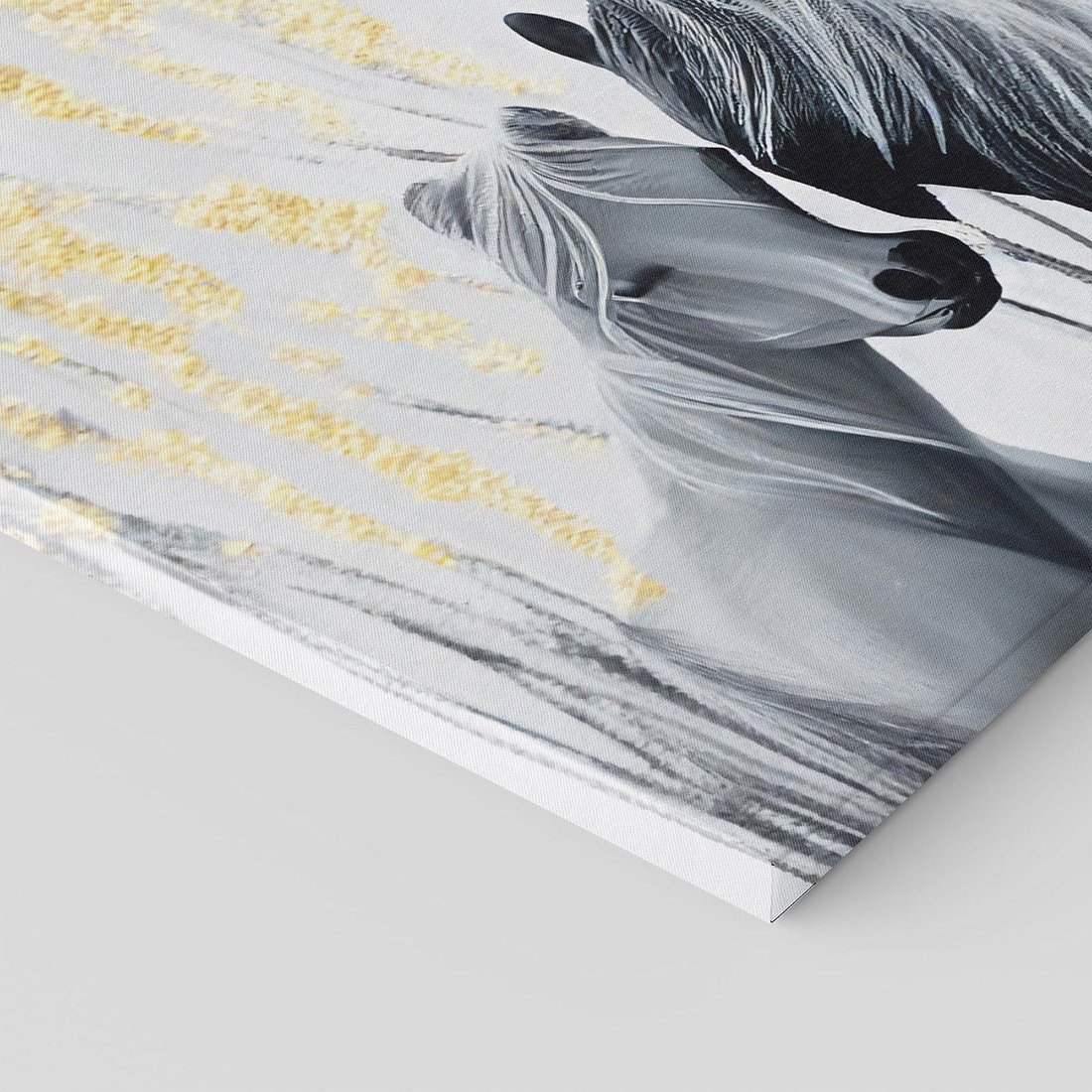 Ten nowoczesny obraz przenosi nas w boho styl, gdzie białe konie biegną po złotej trawie pampas. Kompozycja łączy współczesną grafikę z harmonijnym pięknem natury. To dzieło sztuki emanuje magią i siłą natury, dodając wyjątkowego charakteru do Twojego wnętrza.
