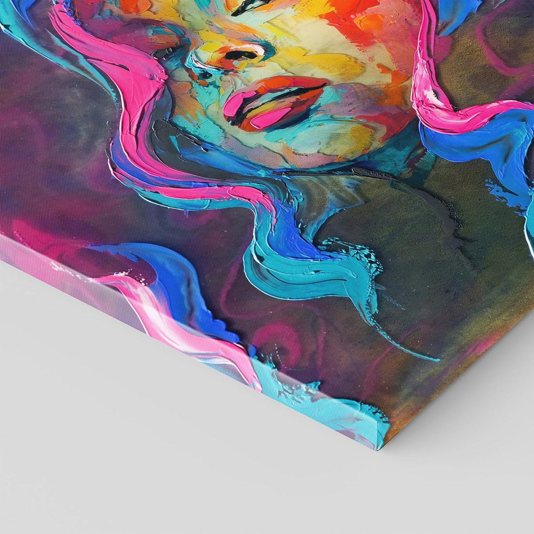 Ta dynamiczna grafika komputerowa odbiega od tradycyjnych portretów i prezentuje abstrakcyjną formę kobiety z bujnymi, intensywnie kolorowymi włosami. Wizualna siła obrazu przypomina olejne malarstwo, co nadaje mu wyjątkowego uroku. To niezwykłe dzieło sztuki pomoże ożywić przestrzeń i przyciągnie uwagę miłośników zarówno sztuki tradycyjnej, jak i współczesnej.