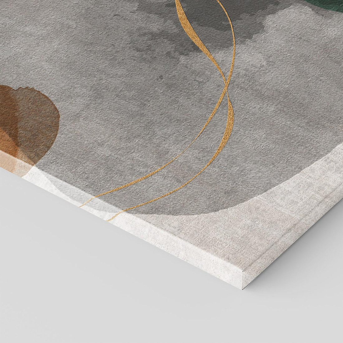 To malowidło akwarelowe prezentuje złote linie w połączeniu z subtelnymi plamami w odcieniach beżów i szarości. Jego nowoczesna estetyka pasuje do salonu, sypialni lub biura, dodając elegancji i spokoju.