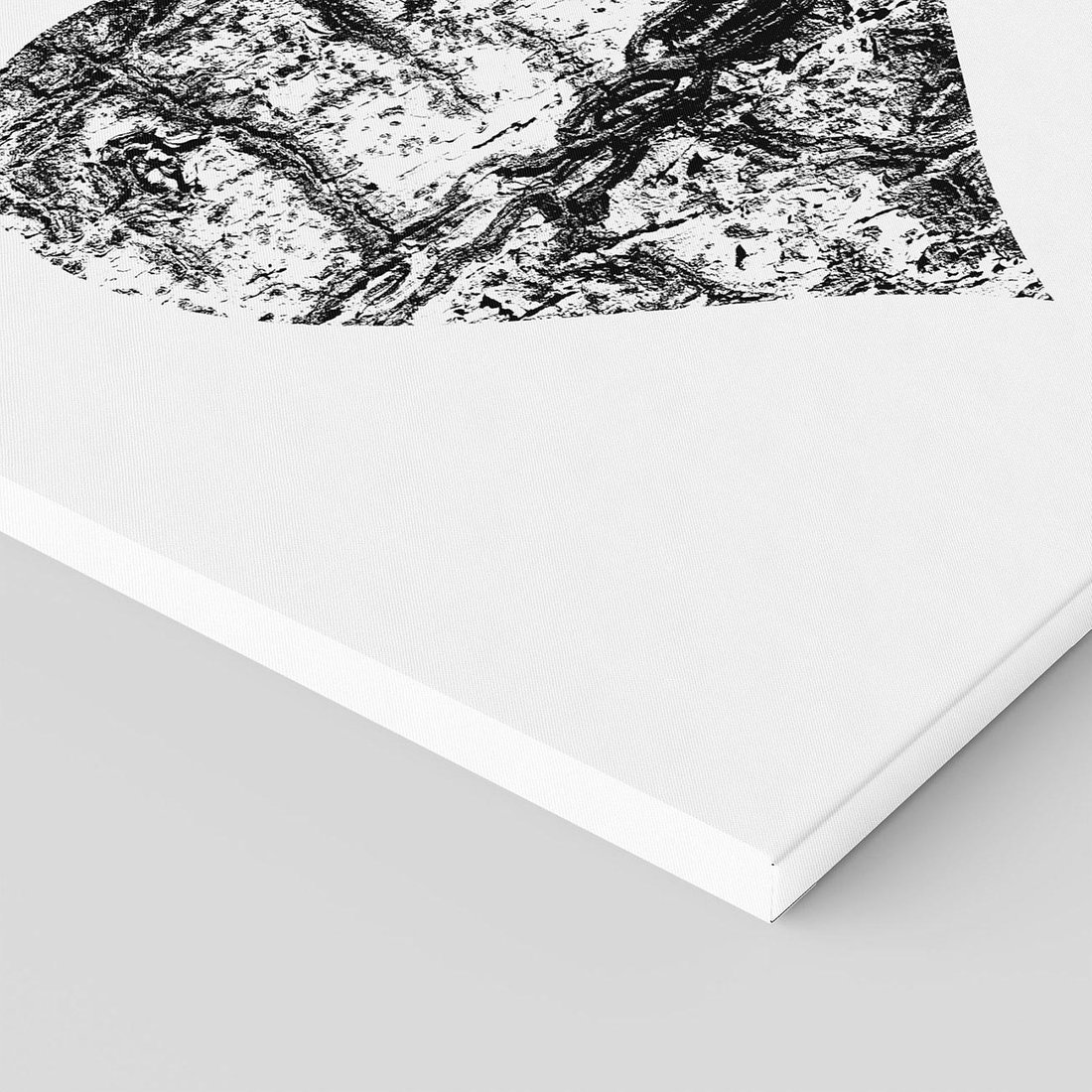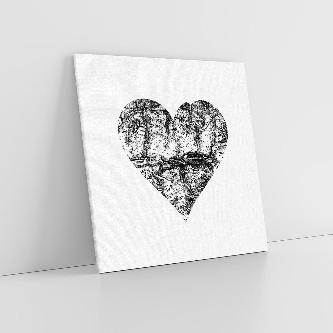 Ta minimalistyczna grafika przedstawia czarne serce z teksturą przypominającą korę drzewa na białym tle. Symboliczne serce, nacechowane naturalnym wzorem, wyraża siłę i trwałość miłości oraz związku z naturą. Kontrast czerni z bielą podkreśla prostotę i głębię przesłania, zachęcając do refleksji nad uniwersalnymi wartościami i relacjami.