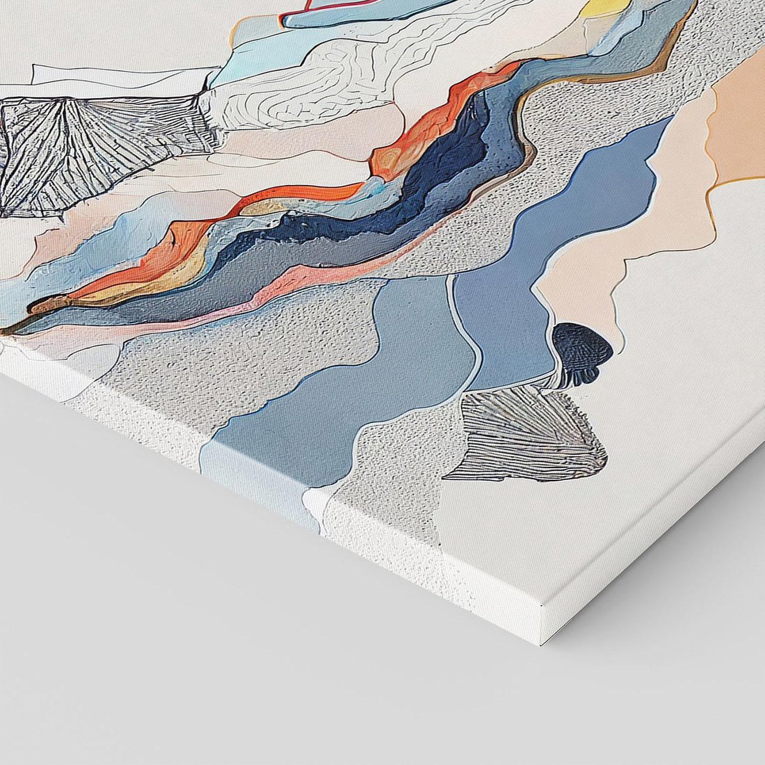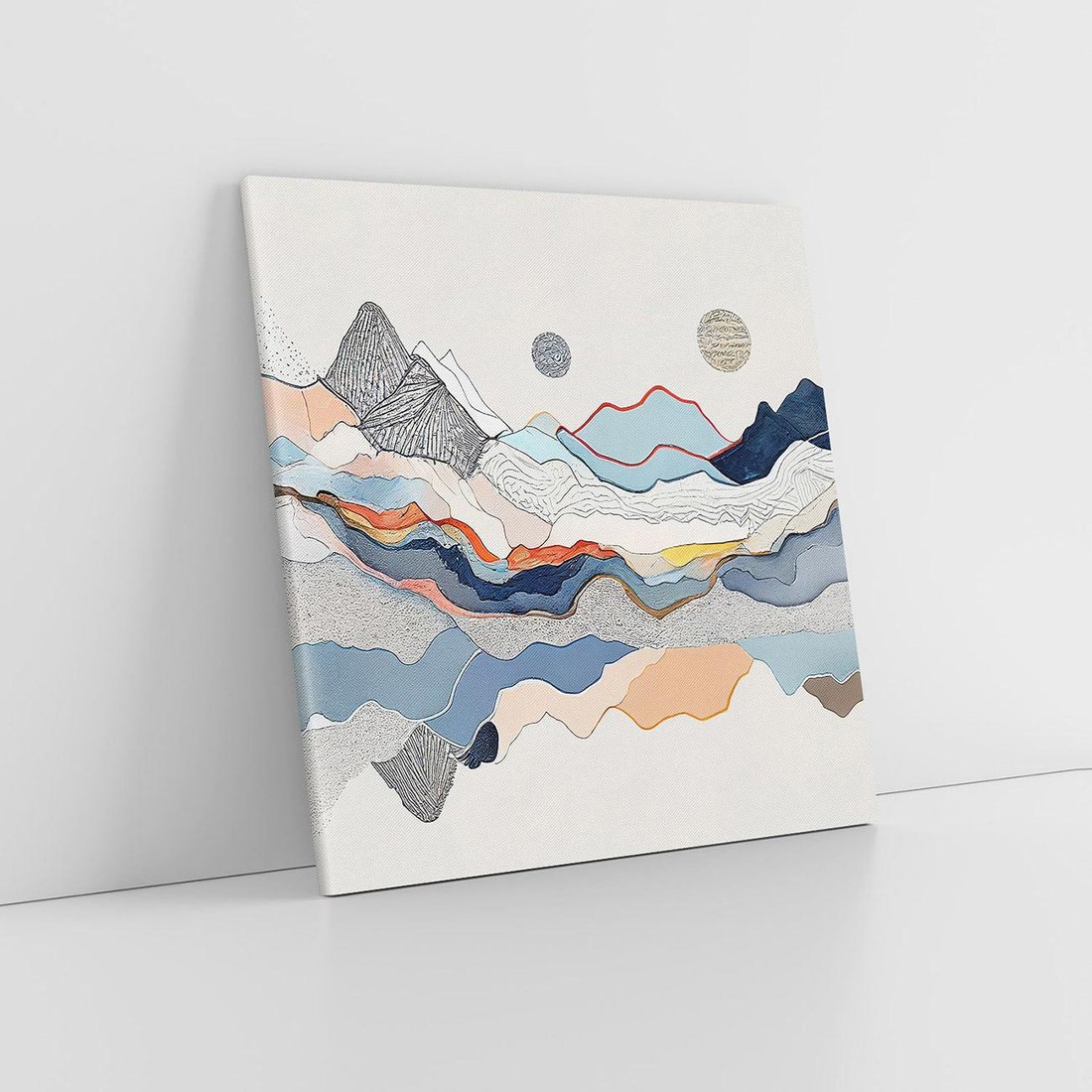 To akwarelowe malowidło łączy graficzne góry z różnymi teksturami, tworząc dynamiczną reprezentację natury. Nowoczesna abstrakcja pasuje do każdego wnętrza, dodając wyjątkowy i inspirujący akcent.