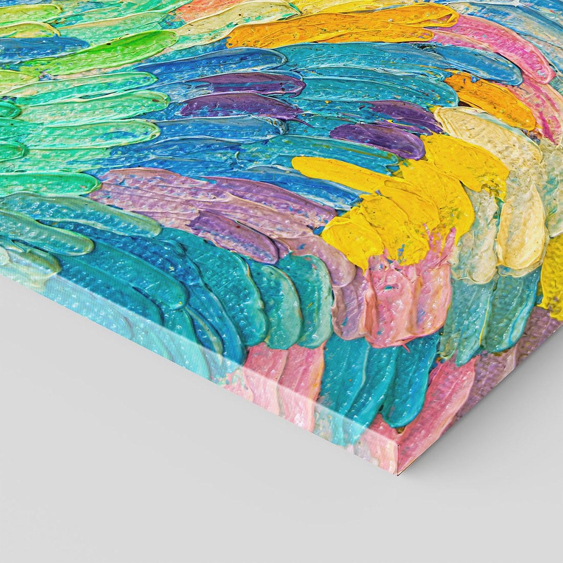 To abstrakcyjne dzieło sztuki przypominające egzotyczne pióra ptaka wzbudza wyobraźnię i zachwyca bogactwem tęczowych kolorów. Farby olejne zostały zastosowane z precyzją, by stworzyć teksturę przypominającą pióra. Obraz emanuje tajemniczością i pięknem natury, idealny dla miłośników egzotycznych krajobrazów i sztuki abstrakcyjnej.