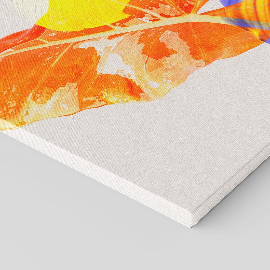 Obraz w stylu retro przedstawia tropikalne liście w energetycznych kolorach indygo i pomarańczu. Kompozycja emanuje radością i świeżością, przyciągając wzrok swoimi tropikalnymi motywami i wyrazistymi kolorami. Idealne dzieło sztuki, aby dodać wnętrzom wyjątkowej atmosfery i pozytywnej energii.