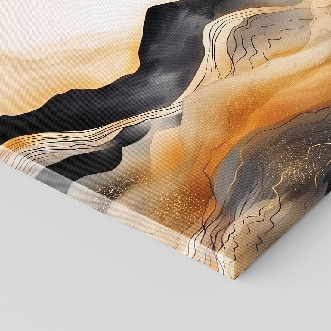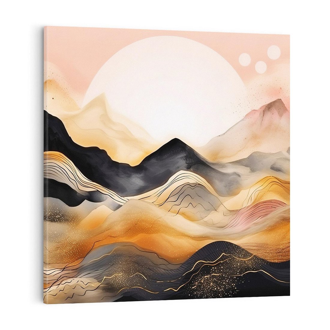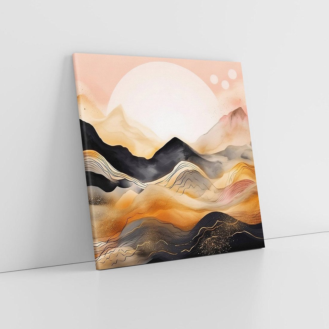 Ta nowoczesna grafika ukazuje urok zachodu słońca nad czarnymi górami. Odcienie pastelowego różu i złota tworzą magiczną atmosferę, przenosząc widza w malowniczy krajobraz. To artystyczne dzieło oddaje piękno natury i wprowadzi harmonię oraz ciepło do każdego wnętrza.