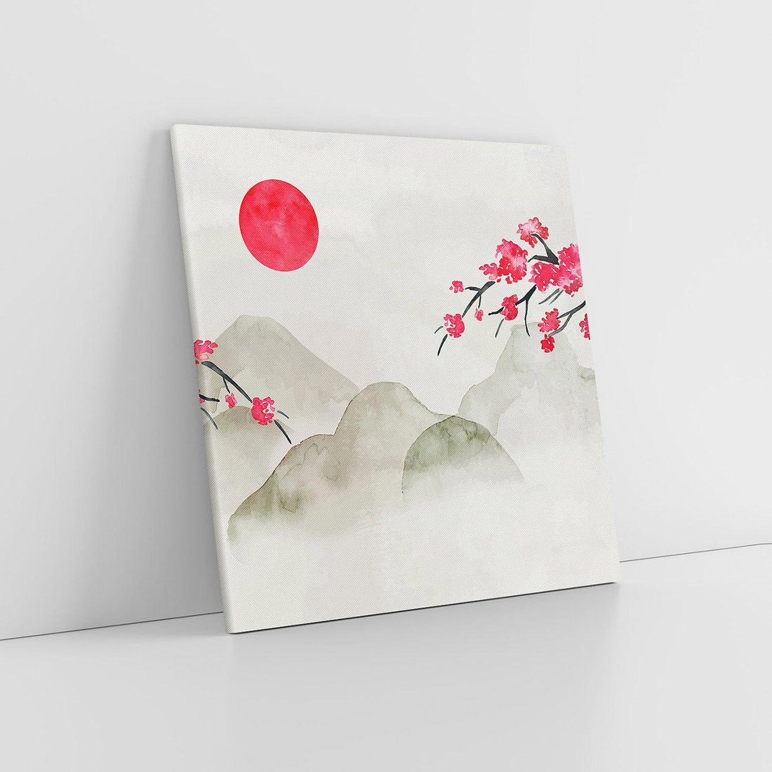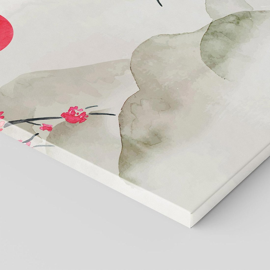 To malownicze dzieło sztuki w stylu Japandi ukazuje górski krajobraz Japonii z kwitnącą wiśnią pod czerwonym zachodzącym słońcem. Kompozycja emanuje harmonią i spokojem, charakterystycznym dla stylu Japandi. Połączenie natury, zachodu słońca i kwitnących wiśni tworzy wyjątkową atmosferę, która przenosi nas w spokojny świat natury.