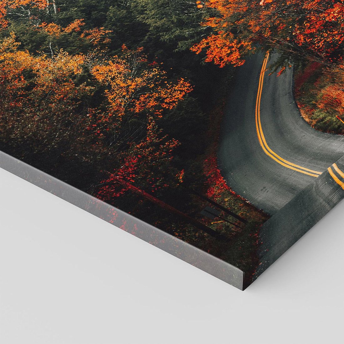 Ta fotografía uchwyciła piękno jesieni, gdzie droga asfaltowa prowadzi przez las, a drzewa mają pomarańczowe liście. Widok pomarańczowych liści drzew tworzy piękny kontrast z drogą i otaczającą przyrodą. Jest to typowy pejzaż jesieni, który oddaje urok i kolorystykę tego sezonu. To zdjęcie może stanowić wspaniałą dekorację dla tych, którzy cenią sobie urok jesieni i chcą wprowadzić go do swojego otoczenia, przypominając o pięknie zmieniającej się przyrody.