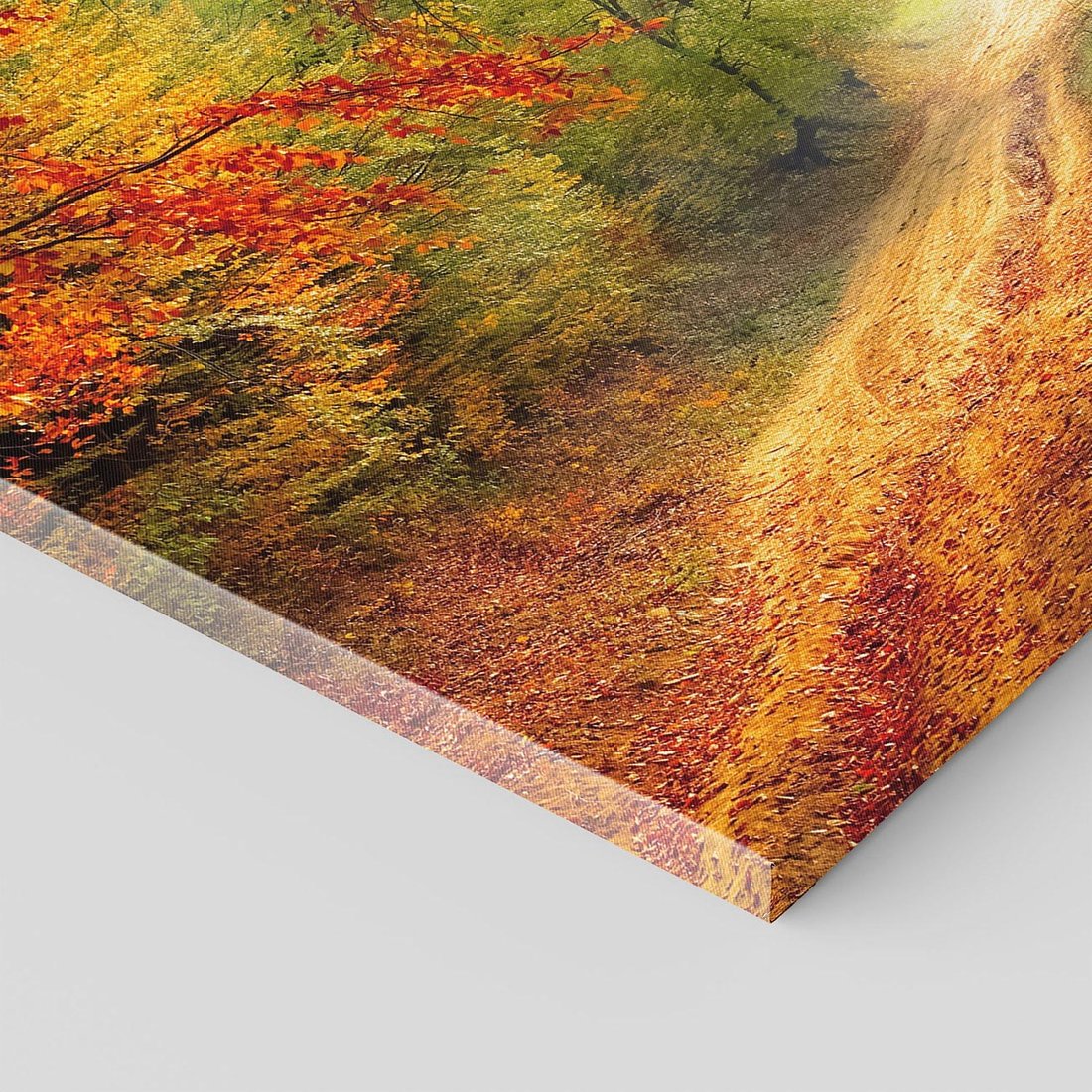 zenieś się w jesienny urok dzięki temu obrazowi przedstawiającemu kolorowe lasy. Spadające liście, złote światło i tajemnicza atmosfera tworzą niesamowitą wizję. Ta kompozycja dodaje ciepła i głębokiej fascynacji jesienią, idealna dla miłośników jesiennych krajobrazów i przytulności natury.