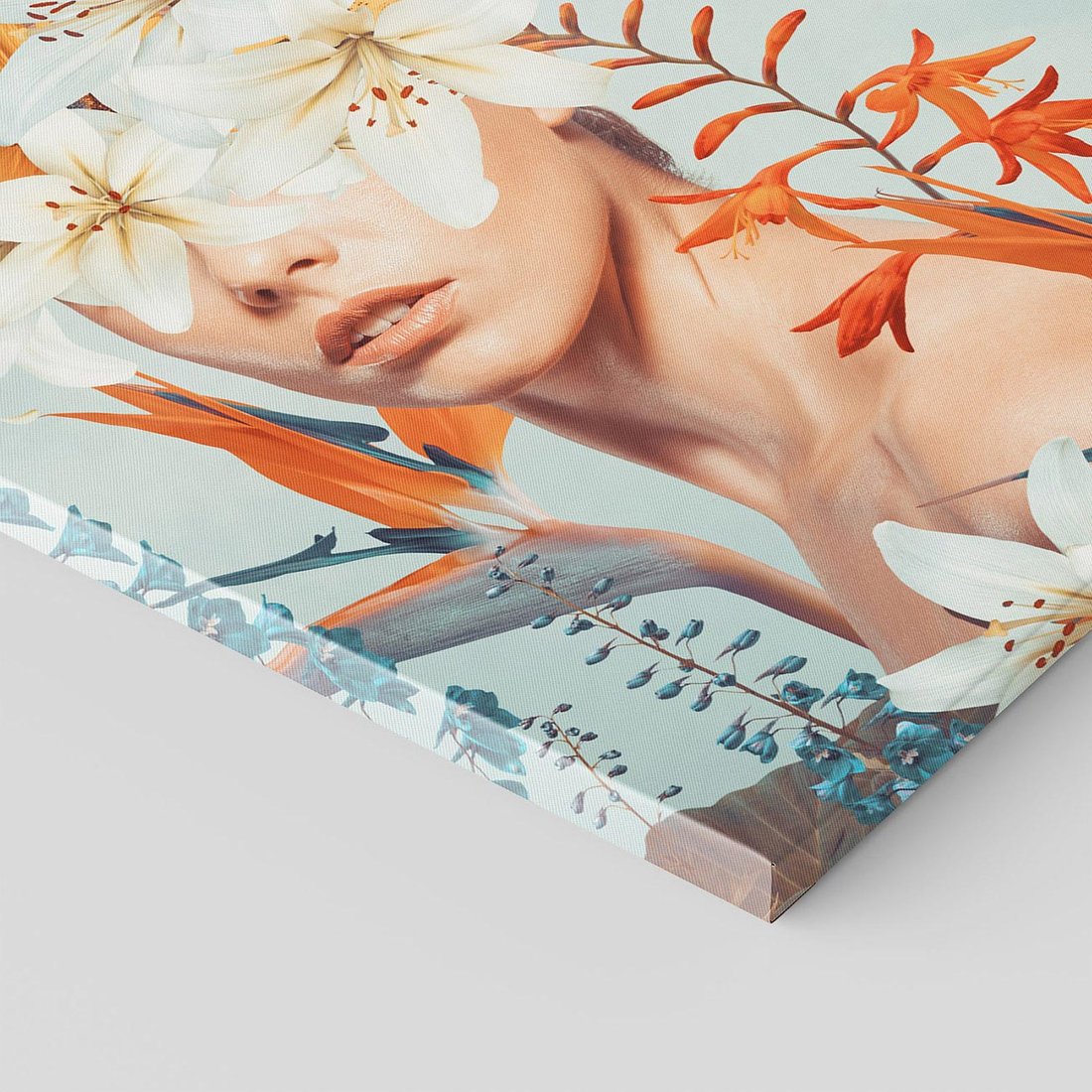 Ten kolaż prezentuje nierealną kompozycję, gdzie portret pięknej kobiety splata się z kwiatowym motywem. Jej twarz i oczy zasłaniają kwiaty, tworząc tajemniczą i zaczarowaną enklawę uroku. "Kwiatowa Enklawa Uroku" to artystyczna podróż w świat wyobraźni, gdzie natura i piękno ludzkiej twarzy tworzą harmonijną i niesamowitą całość.