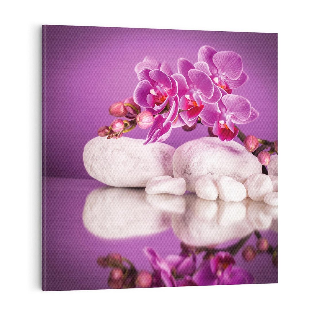 Ożyw swoje wnętrze tym uroczym obrazem przedstawiającym orchideę w SPA. Delikatne płatki kwiatów, spokojne kolory i harmonijna atmosfera tworzą relaksującą scenerię. Ta kompozycja dodaje równowagi i odprężenia, idealna dla osób pragnących stworzyć atmosferę spokoju i harmonii w swoim domu lub przestrzeni relaksacyjnej.