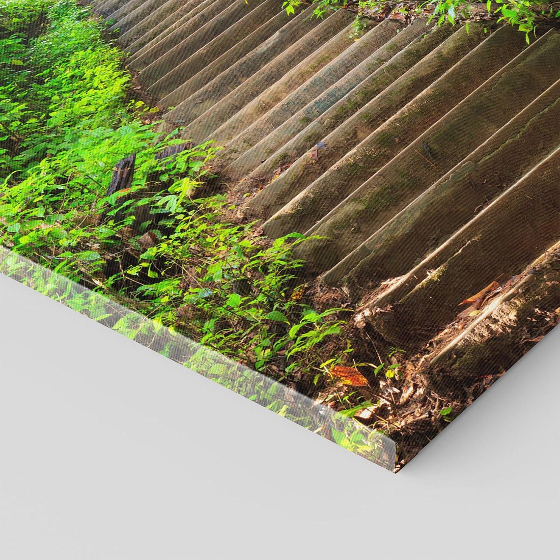 Przenieś się w malowniczy świat lasu dzięki temu ujmującemu obrazowi przedstawiającemu ścieżkę i schody otoczone drzewami. Złociste promienie, cień i ukryte tajemnice tworzą magiczną atmosferę. Ten obraz dodaje tajemniczości i przygody, idealny dla miłośników natury i osób pragnących przenieść się w inny świat.
