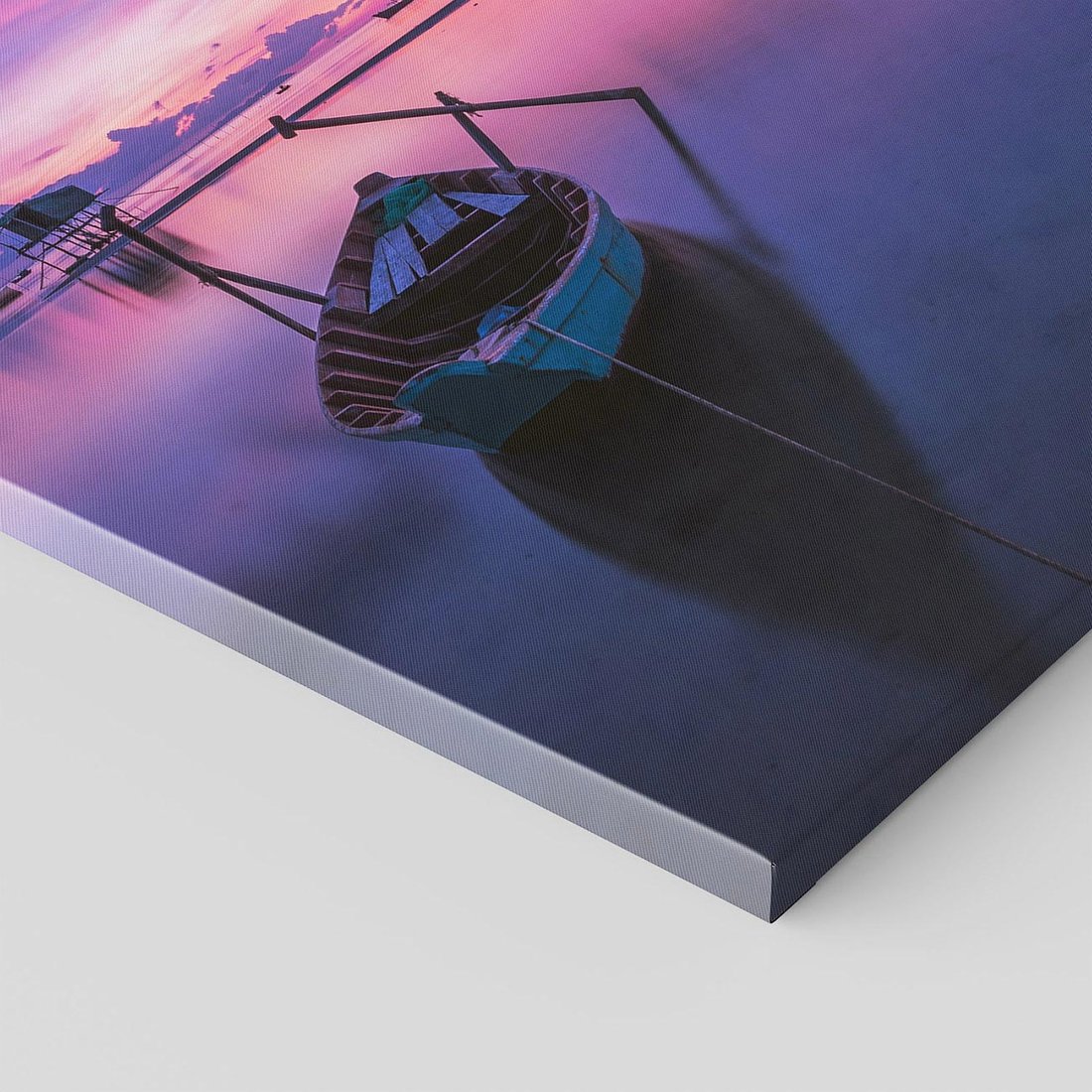 Ten romantyczny obraz ukazuje łódkę unoszącą się na falach morza w magicznym momencie zachodu słońca. Przenieś się w atmosferę spokoju i romantyzmu, obserwując ten malowniczy widok. Dodaj nutę błogości i uroku morskiego do swojego wnętrza tym wyjątkowym obrazem.