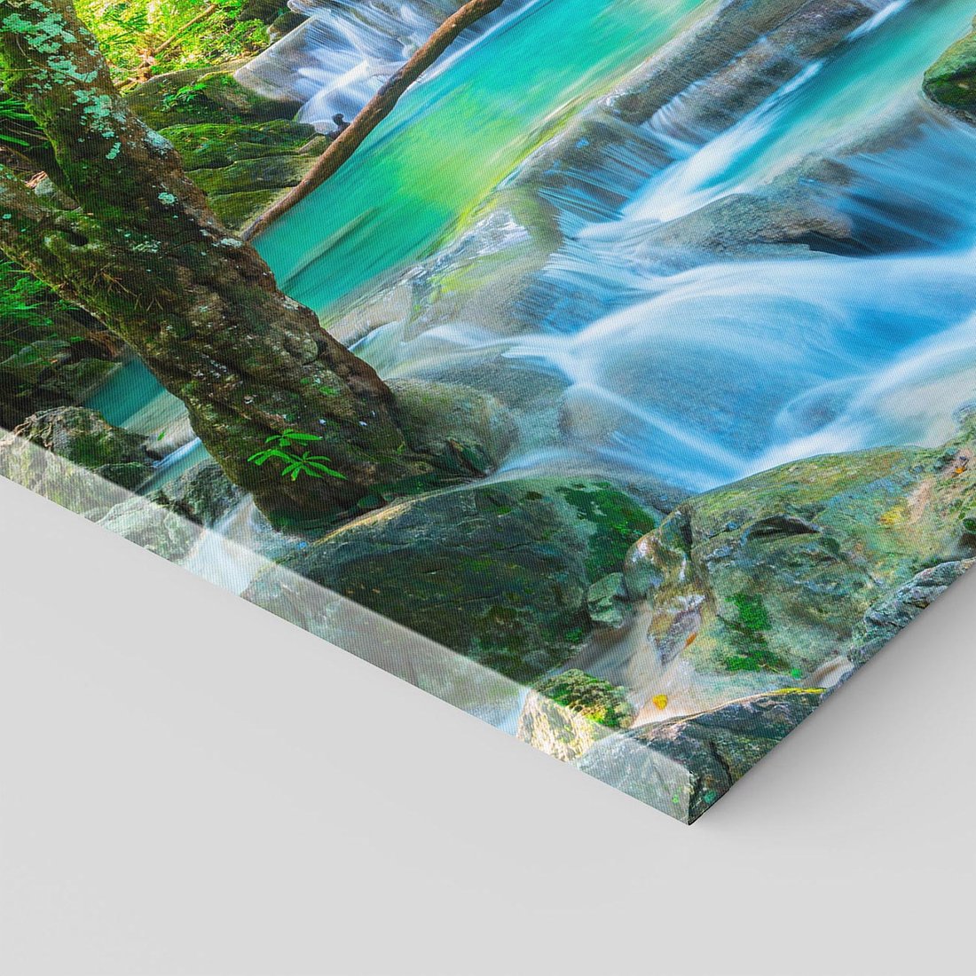Ożyw swoje wnętrze tym uroczym obrazem przedstawiającym wodospad w lesie nad rzeką. Szum wody, zieloność drzew i mistyczna atmosfera tworzą aurę magicznego miejsca. Ta kompozycja dodaje harmonii i spokoju, idealna dla osób pragnących wprowadzić do swojego wnętrza naturalną siłę i urok wodospadu.