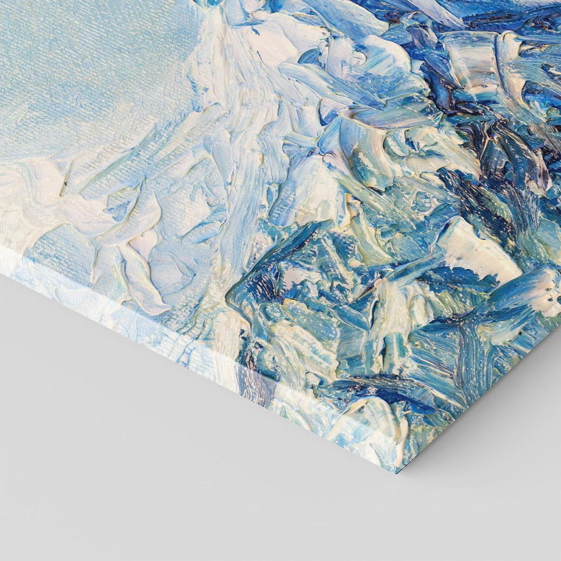Ten olejny obraz ukazuje górski pejzaż z ośnieżoną górą, która wznosi się ponad malowniczą krainą. Błękity dominujące w kompozycji podkreślają spokój i majestat natury. "Majestat Błękitnych Szczytów" przenosi nas w piękno alpejskiej krainy, gdzie błękitne odcienie nieba i śniegu tworzą niesamowitą atmosferę i przestrzeń.