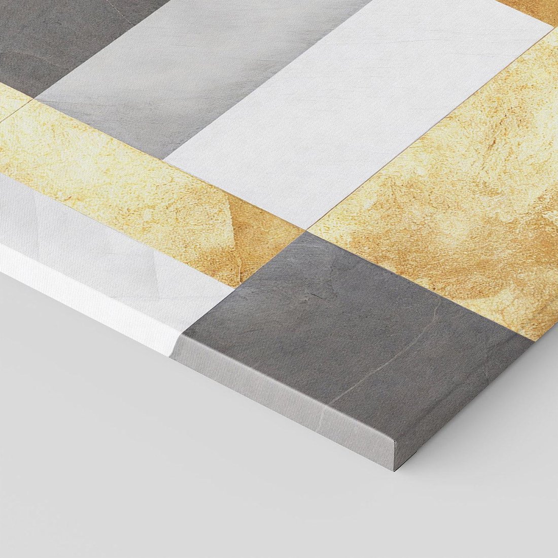 Ten abstrakcyjny obraz łączy geometryczne linie ze złotymi i szarymi blokami marmuru. Złota tekstura nadaje elegancji i nowoczesności. Szary marmur dodaje luksusowego akcentu, tworząc wyjątkowy obraz idealny do nowoczesnych pomieszczeń. To wyrafinowane połączenie abstrakcji i marmuru wzbogaci każde wnętrze.