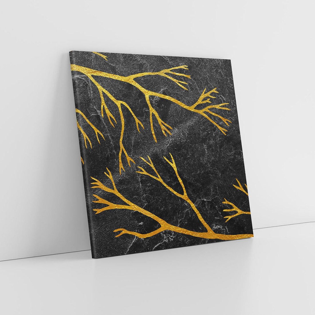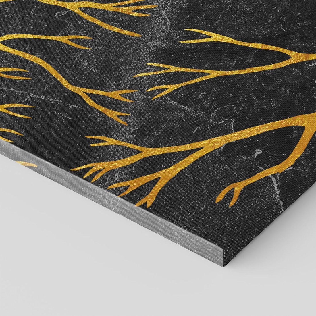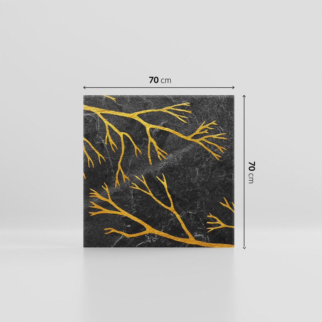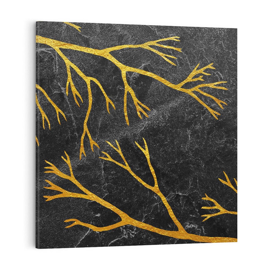 Ten metaforyczny obraz przedstawia złote gałęzie drzew na czarnym marmurowym tle, emanujący elegancją i tajemniczym urokiem. Minimalistyczny design podkreśla wyrafinowany charakter kompozycji. To dzieło sztuki przenosi widza w niezwykłą przestrzeń, gdzie złoto symbolizuje światło i nadzieję w ciemnościach. Idealny dodatek do wnętrz, które pragną zachować wyjątkowy i niezwykły wystrój.