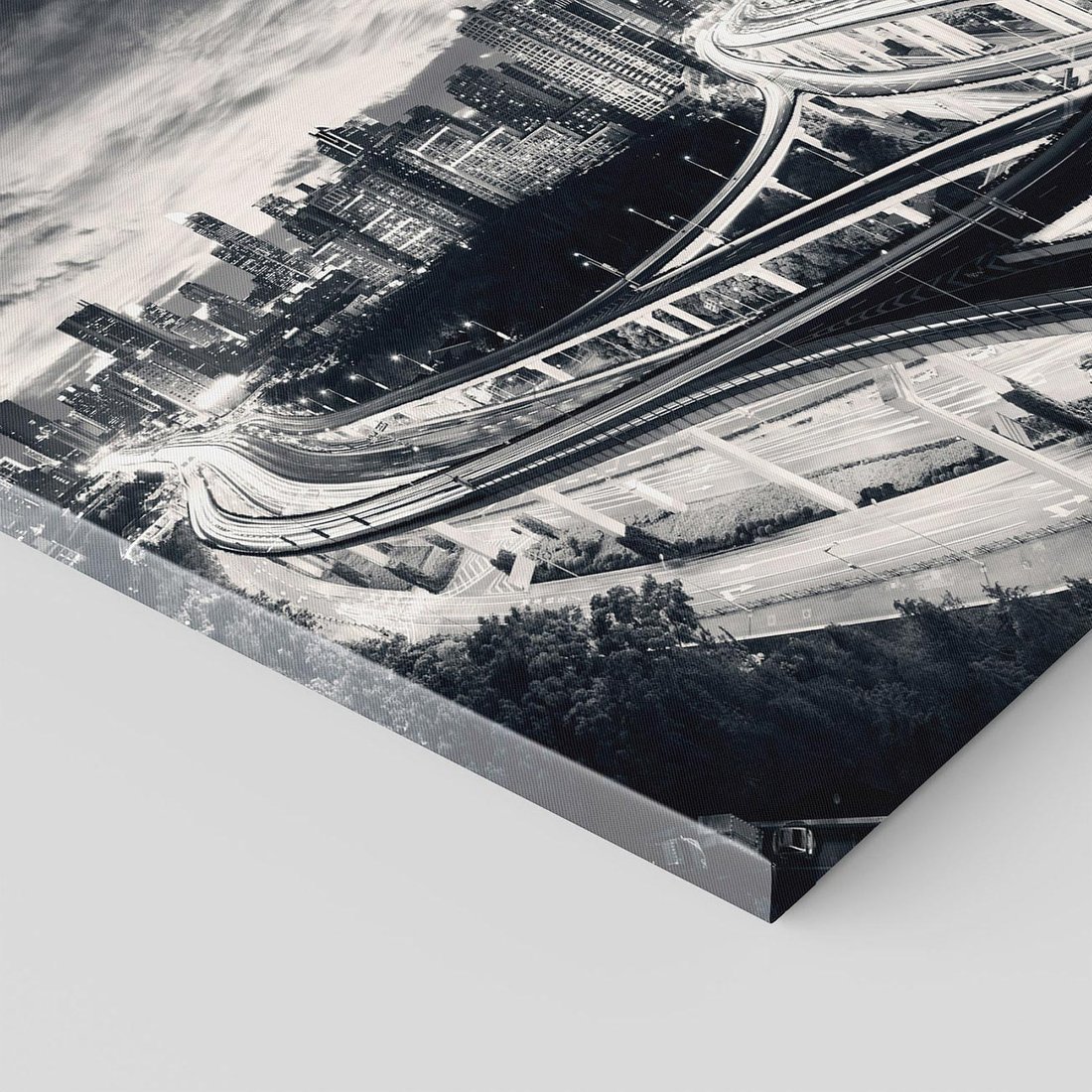 Ten ujmujący obraz ukazuje magiczną atmosferę miasta nocą. Wśród mieniących się świateł i górskiej panoramy odczuwa się energię i tajemniczość. Ta kompozycja dodaje dynamizmu i nowoczesności, idealna dla miłośników nocnych pejzaży i miejskiej atmosfery.