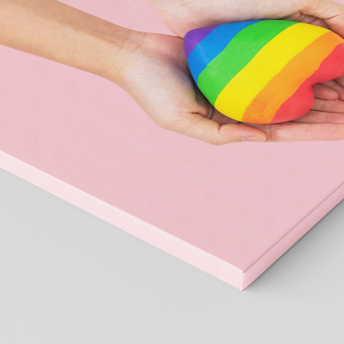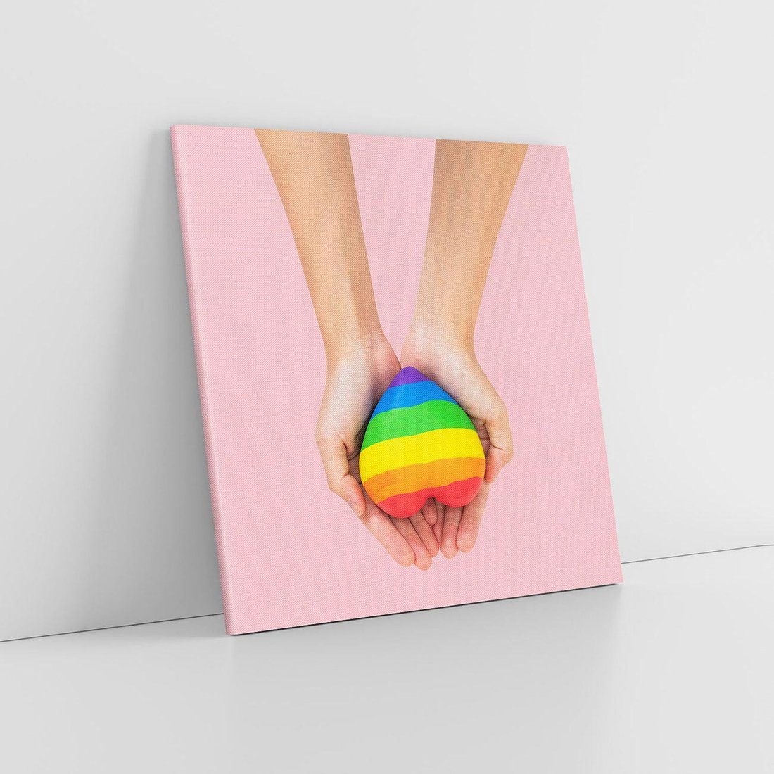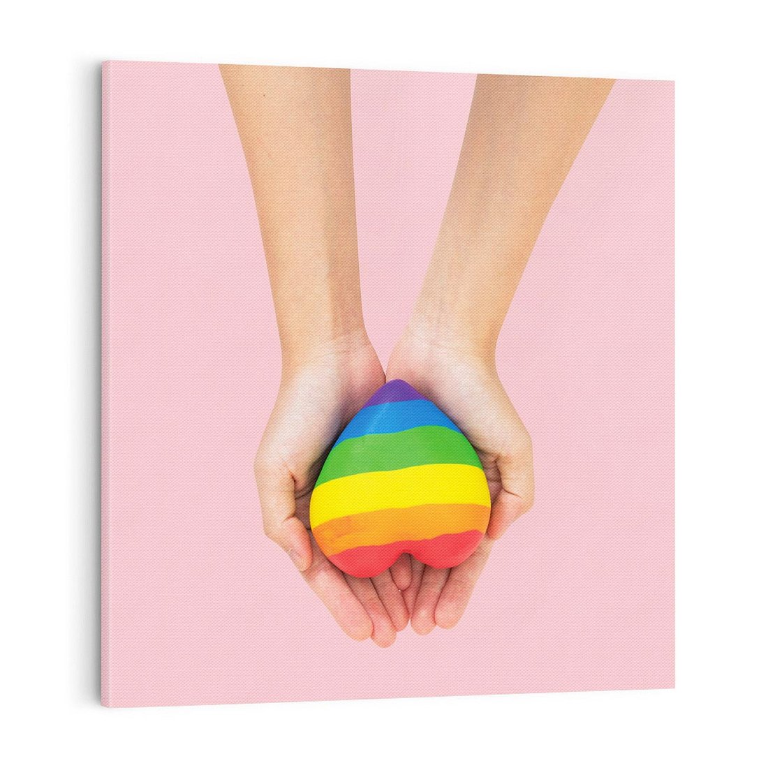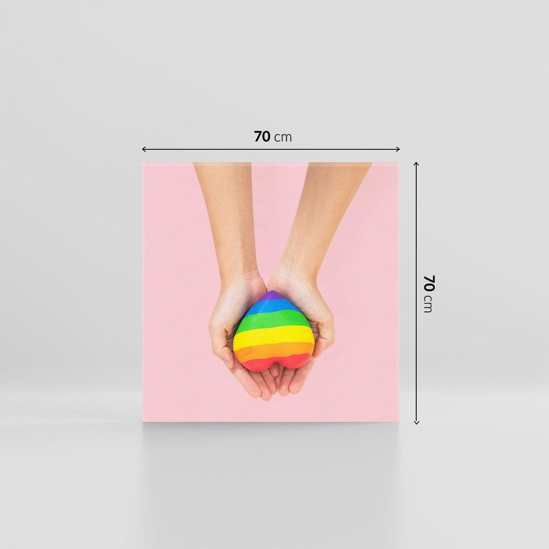 Obraz na płótnie 70x70 - Miłość na Dłoniach - zdjęcie, dłonie trzymają ulepione tęczowe serce