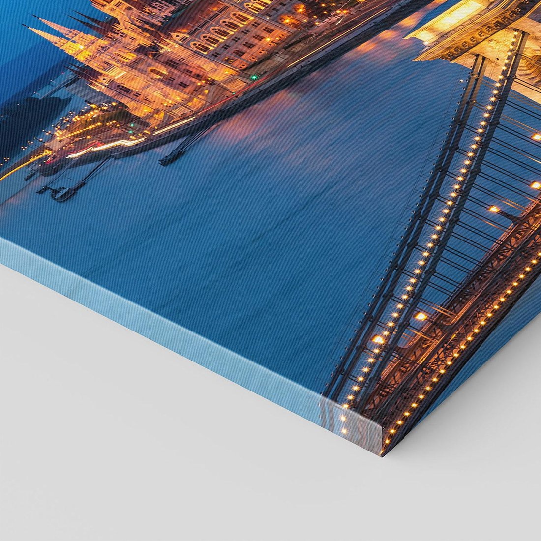 Ta tajemnicza sceneria nocnego miasta przedstawiona na obrazie na płótnie zapewnia niezapomniane wrażenia. Mosty oświetlone w świetle lamp i refleksy wody tworzą atmosferę magii i romantyzmu. Idealny dodatek do nowoczesnych wnętrz.