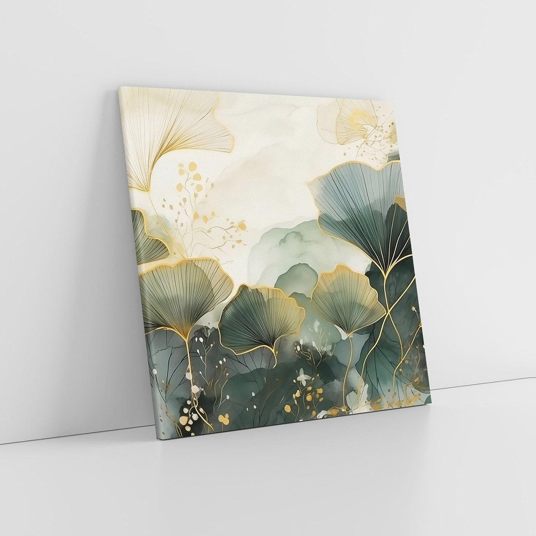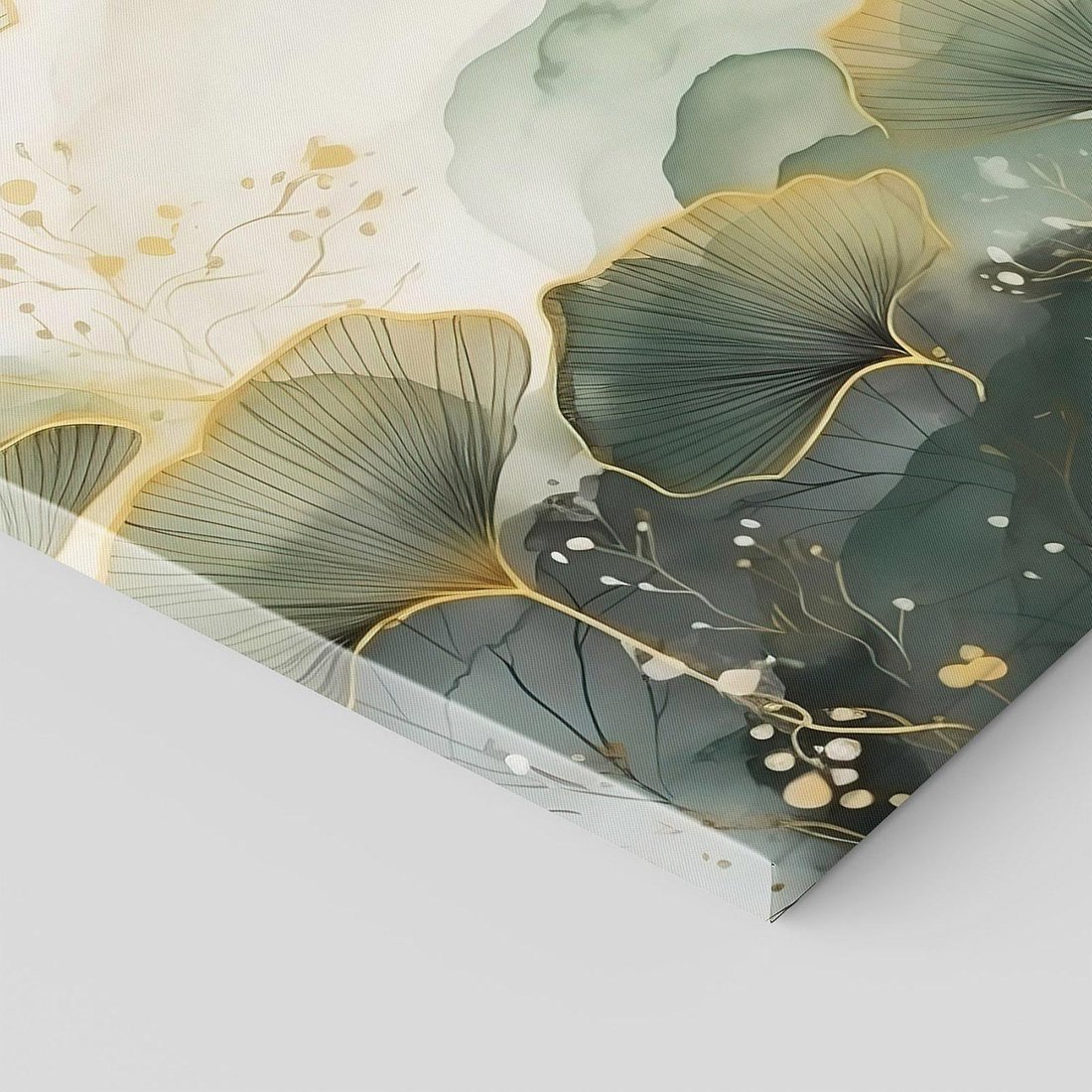 Ten malowniczy obraz przedstawia liście miłorzębu japońskiego w zgaszonej zielonej tonacji, z pięknym akwarelowym efektem. Złote elementy dodają subtelnej elegancji, nadając kompozycji wyjątkowego uroku. To artystyczne dzieło sztuki wprowadzi wspaniały akcent natury do Twojego wnętrza, zachwycając oryginalnością i delikatnością.