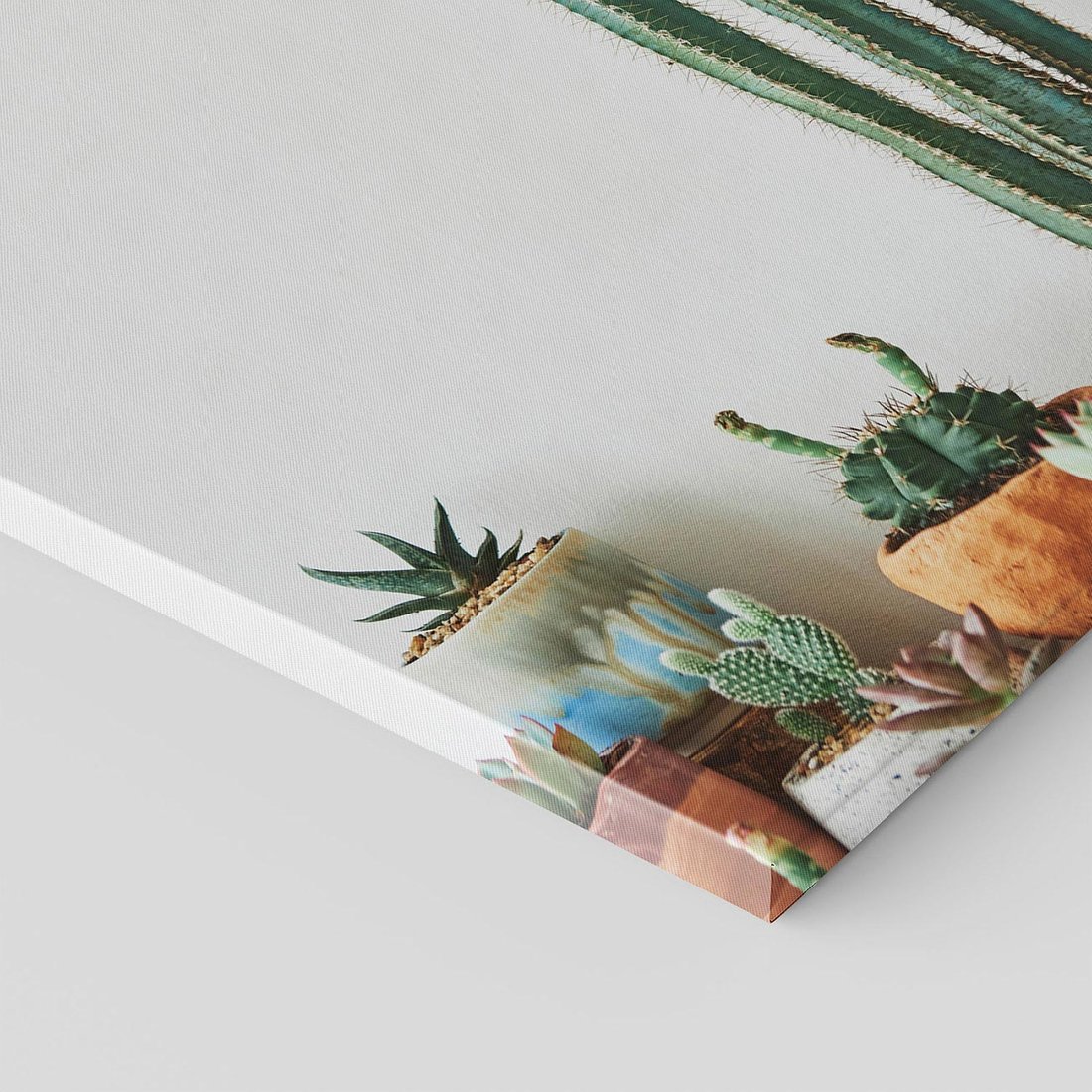 Ożyw swoje wnętrze naturalną harmonią za pomocą obrazu przedstawiającego kaktusy i liście sukulenty. Poczuj spokój i siłę natury, obserwując te wyjątkowe rośliny na tle minimalistycznej kompozycji.