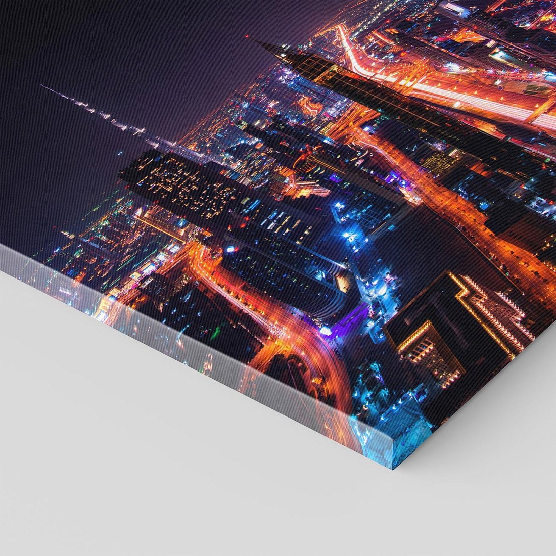 Przenieś się w nocne oświetlenie miasta dzięki temu obrazowi przedstawiającemu malowniczą panoramę. Migoczące światła, wysokie wieżowce i tajemnicza atmosfera tworzą niesamowity widok. Ten obraz dodaje energii i fascynacji miejskim krajobrazem, idealny dla miłośników nocnych pejzaży i atmosfery wielkomiejskich nocy.