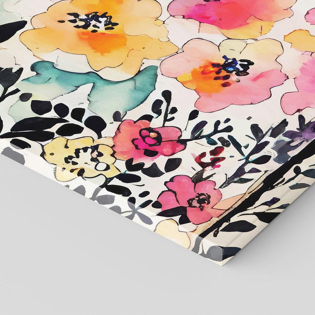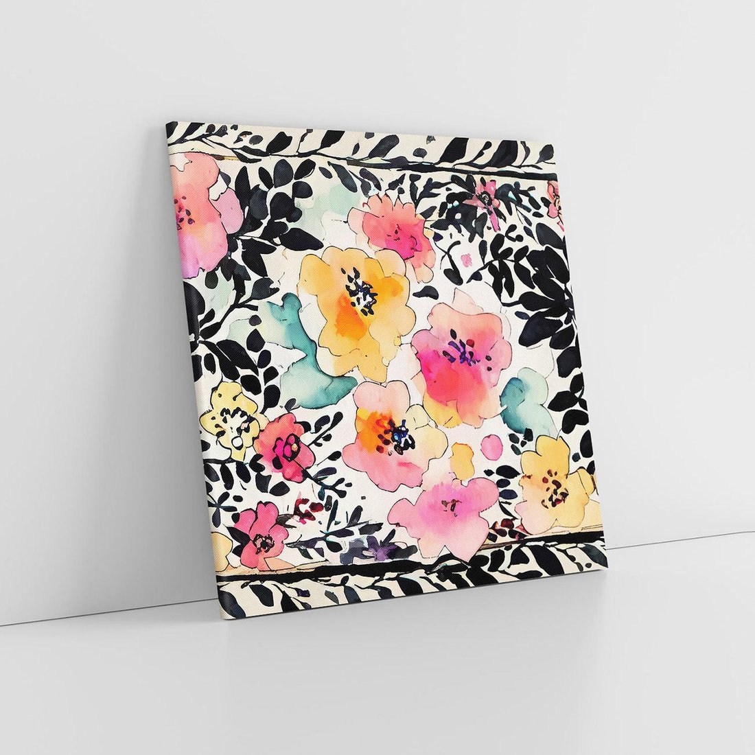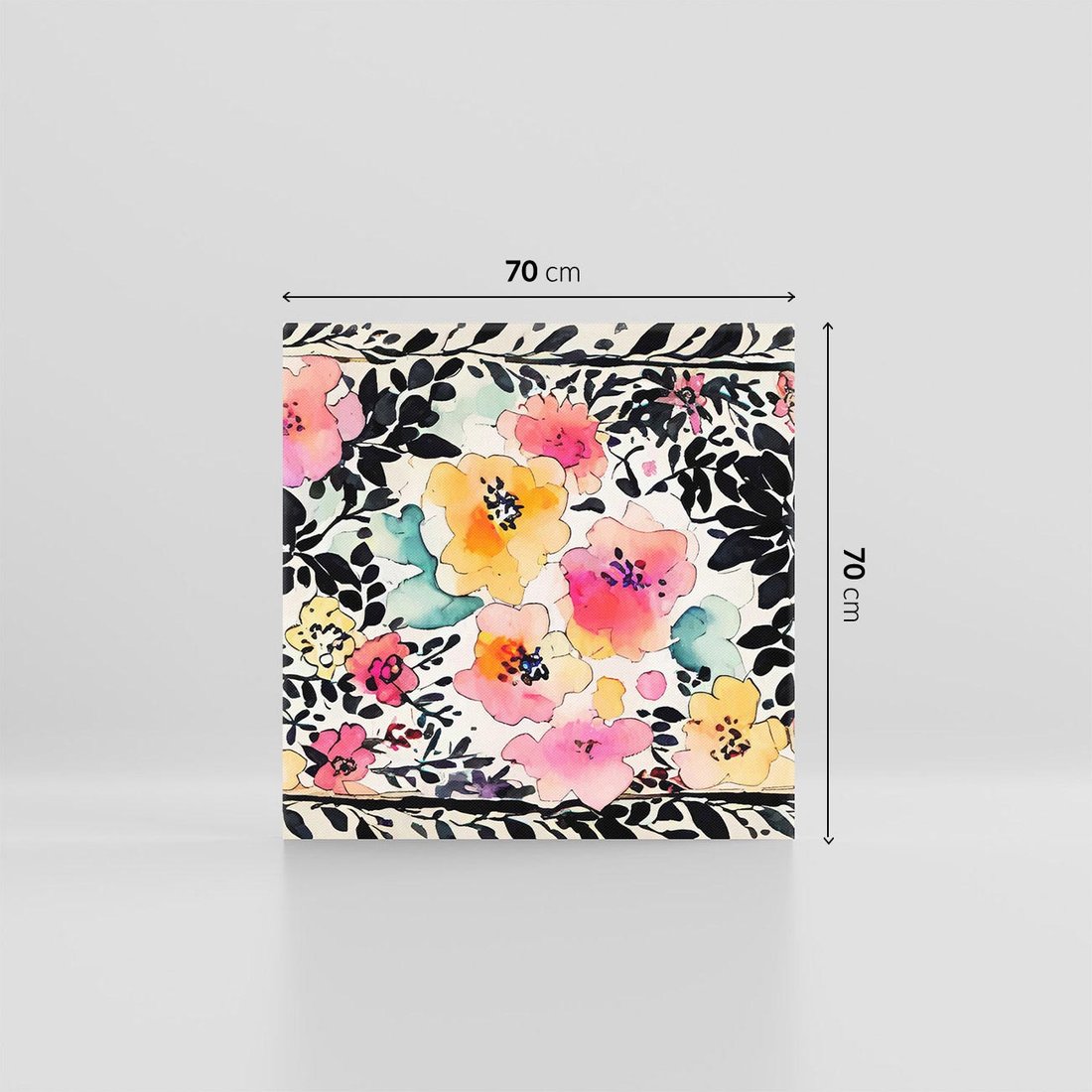 Obraz na płótnie 70x70 - Opowieść w kroplach farb - akwarelowe kwiaty, mocna ornamentowa czarna ramka namalowana dookoła obrazu