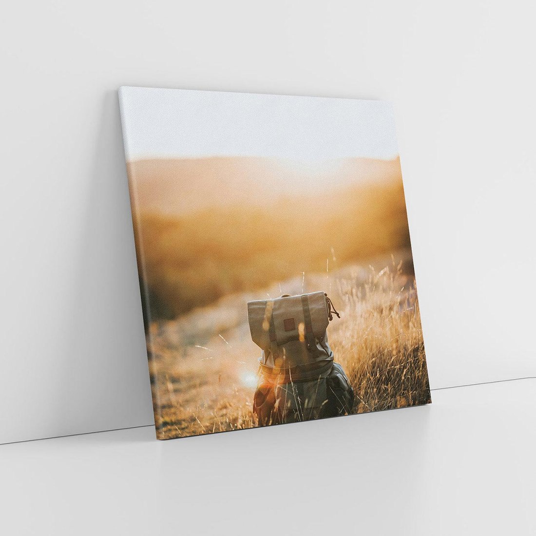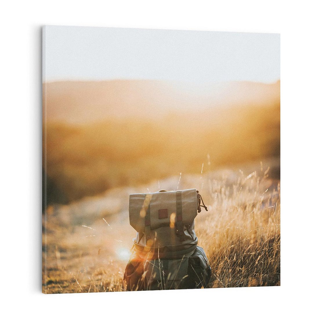 Obraz na płótnie 70x70 - Podróżniczy bukiet na łące - plecak, podróż