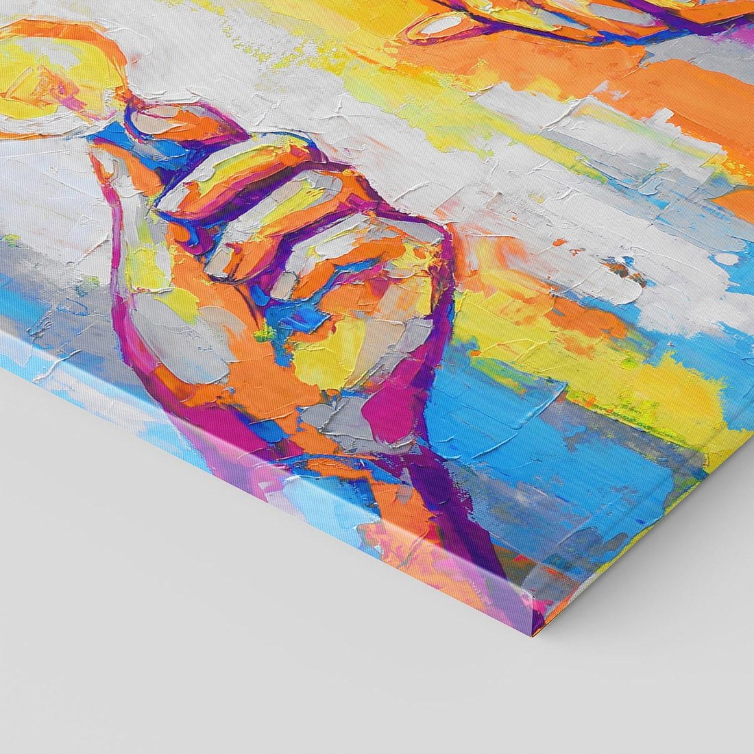 To abstrakcyjne dzieło ukazuje dłoń trzymającą żarówkę, symbolizującą pomysł i inspirację. Nieoczywiste kolory, głównie żółć i niebieski, podkreślają niezwykłość i wyjątkowość tej idei. Całość kompozycji emanuje kreatywnością i wizją, zachęcając widza do odkrywania nowych horyzontów. To malarskie arcydzieło przypomina nam, jak ważne jest odkrywanie nieznanych obszarów umysłu, by odnaleźć wyjątkowe rozwiązania.