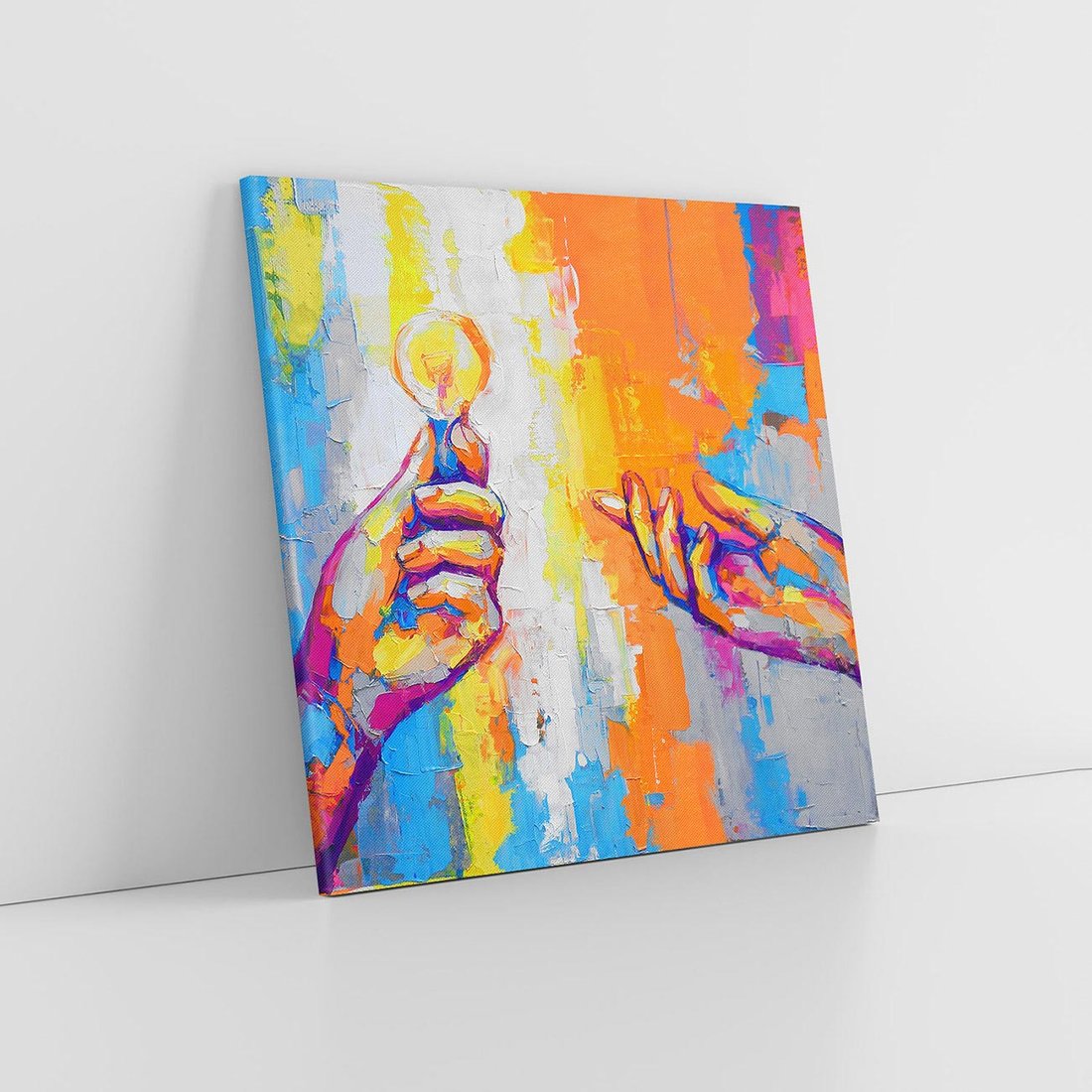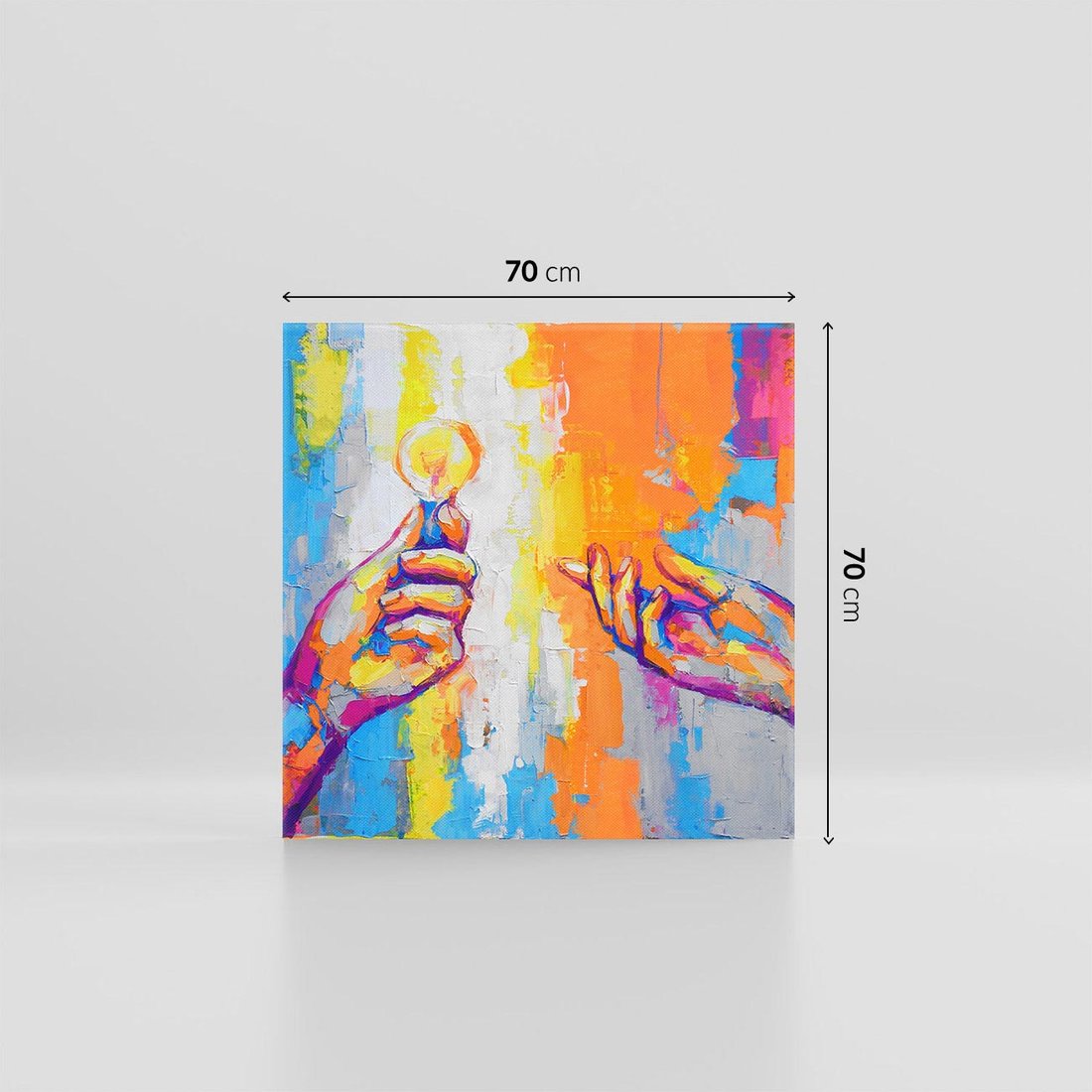 Obraz na płótnie 70x70 - Refrakcje wewnętrznego światła - abstrakcyjne dzieło, dłoń trzyma żarówkę