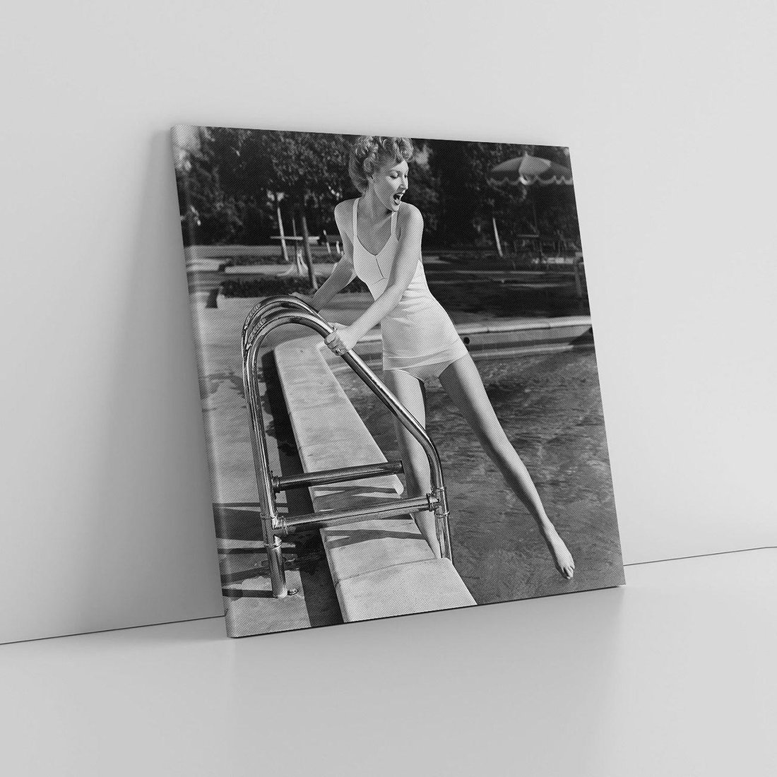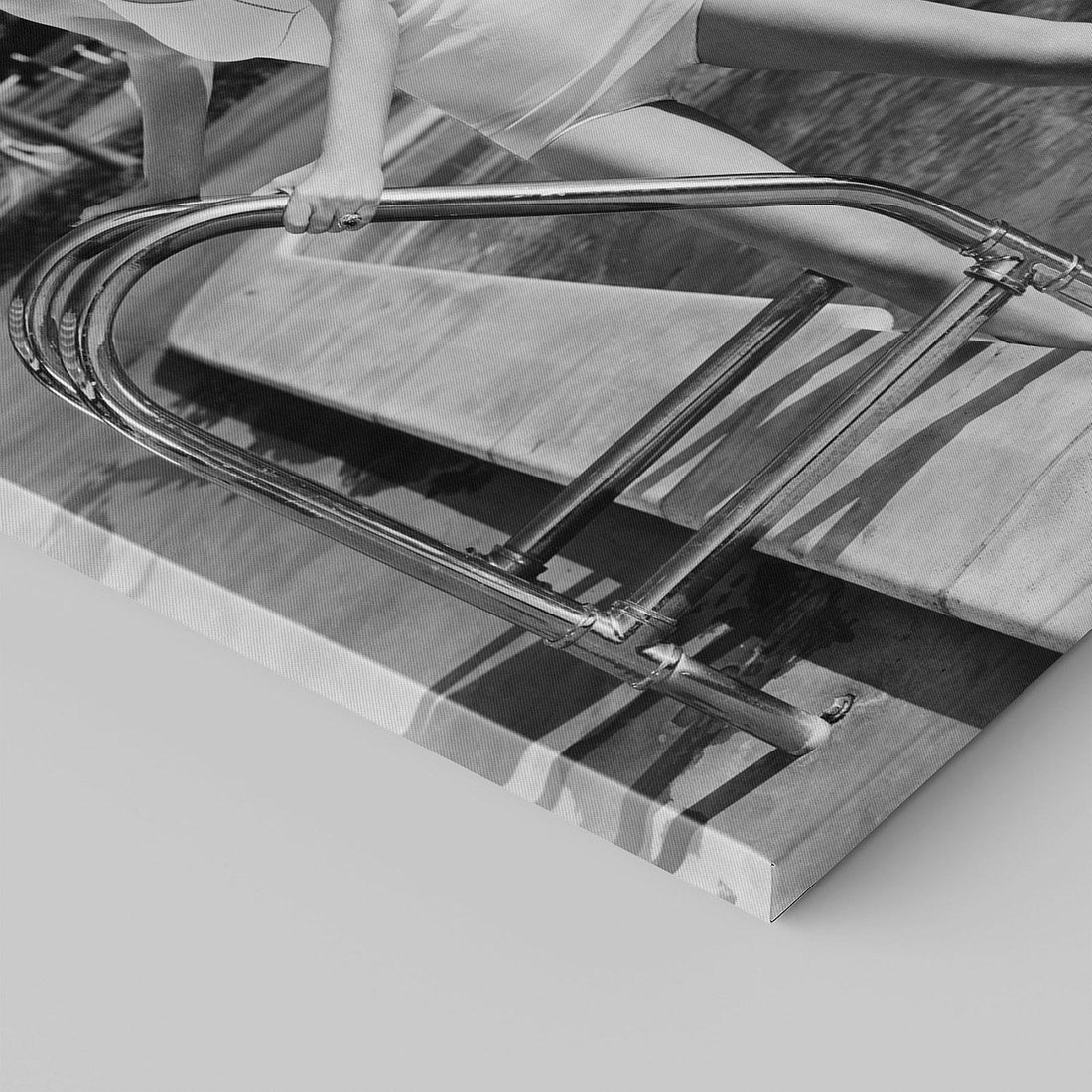 To retro zdjęcie w czerni i bieli przedstawia urok staromodnego stylu pin up. Na fotografii widoczna jest kobieta w eleganckim stroju kąpielowym wchodząca do basenu. Obraz ten przenosi nas w czasie do epoki pełnej klasy i wdzięku. Jest to doskonały wybór dla miłośników stylu retro oraz dla tych, którzy chcą dodać nutkę nostalgii i elegancji do swojego wnętrza.