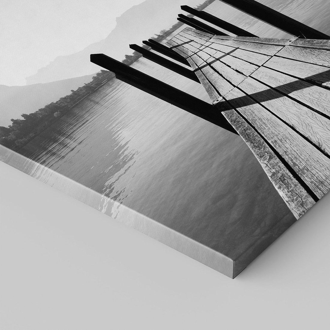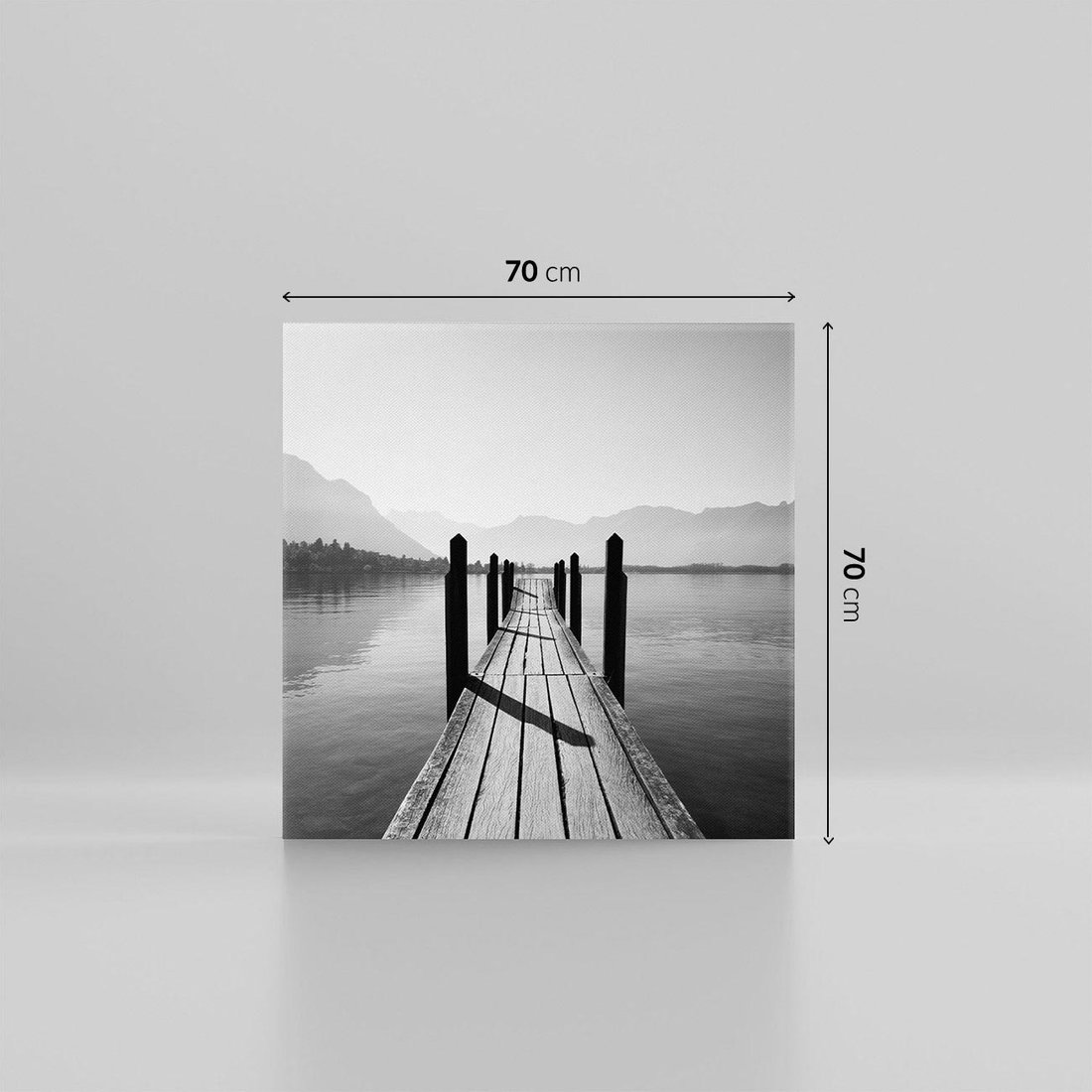 Obraz na płótnie 70x70 - Spokojna Przystań - czarno biała fotografia, drewniany pomost na jeziorze