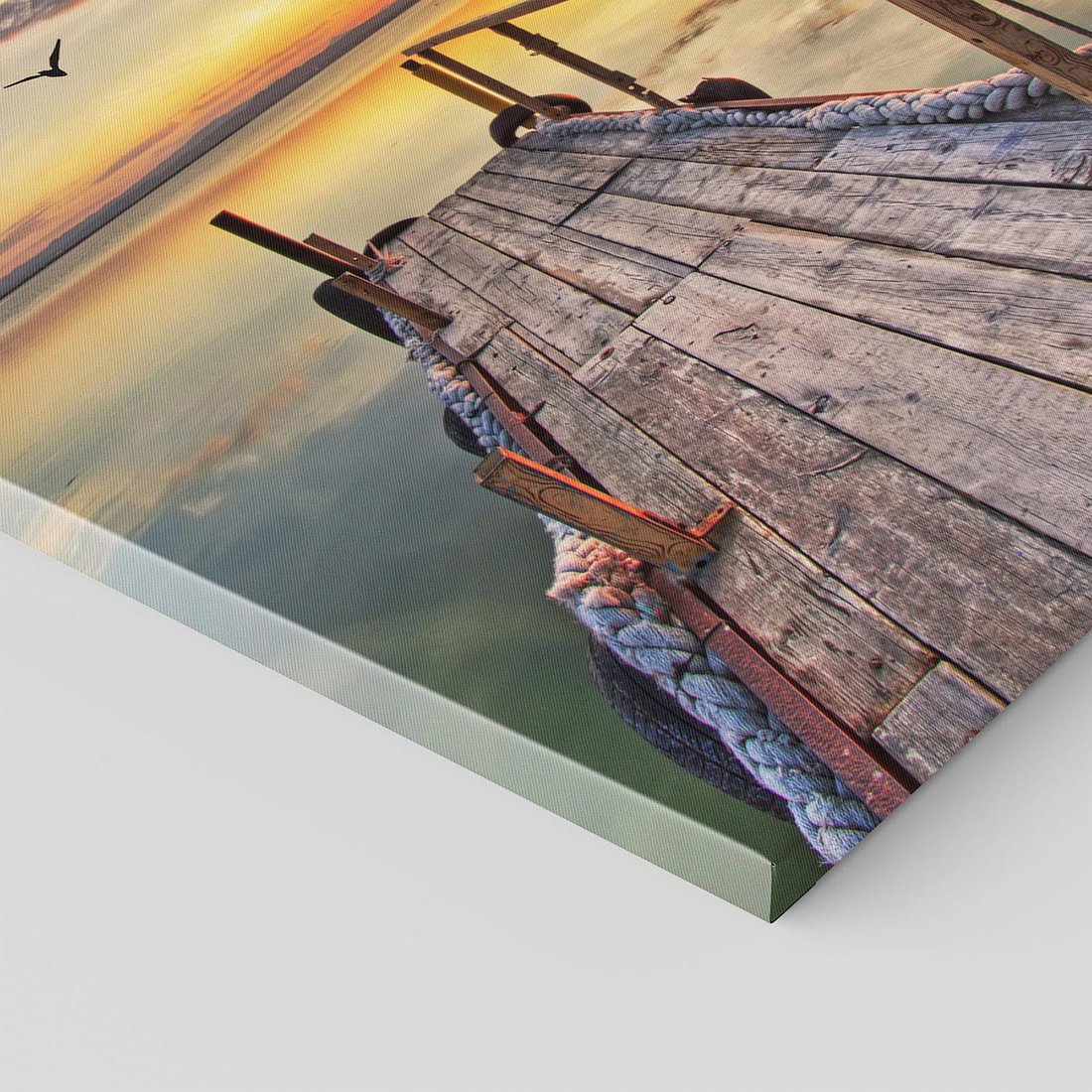 Przenieś się w sielankowy krajobraz nad jeziorem dzięki temu uroczemu obrazowi przedstawiającemu spokojny pomost. Spokój wody, delikatne odbicia i błękitne niebo tworzą harmonijną aurę. Ta kompozycja dodaje relaksu i harmonii, idealna dla osób pragnących wprowadzić do swojego domu odczucie ciszy i spokoju nad jeziorem.