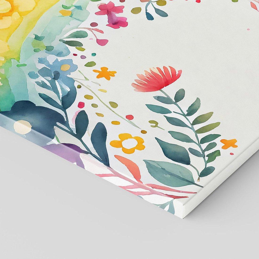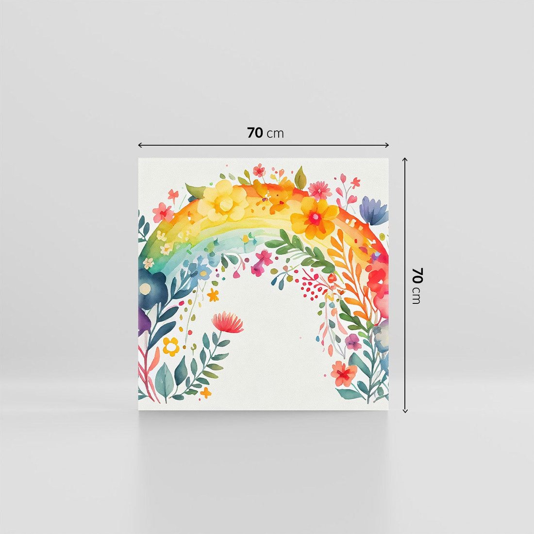 Ten uroczy obraz idealnie pasuje do pokoju Twojej małej dziewczynki. Na tle kolorowej tęczy rozkwitają piękne kwiaty, tworząc harmonijną i radosną kompozycję. Odcienie tęczy wprowadzają magię do przestrzeni, a delikatne akwarelowe pociągnięcia pędzla dodają mu lekkości. To dzieło sztuki stworzone, aby rozpromieniać przestrzeń i spełniać marzenia Twojego dziecka.