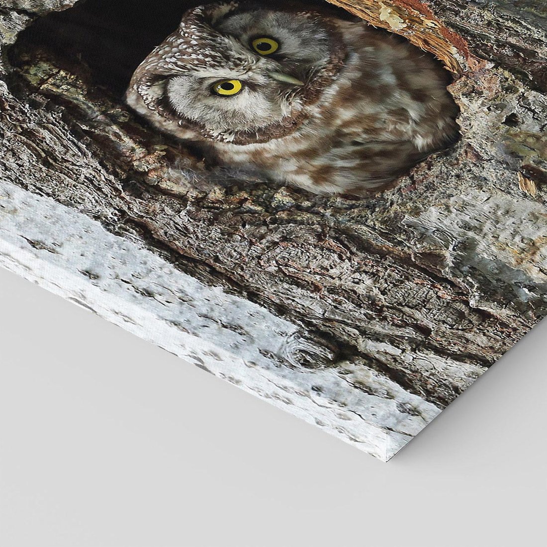 Przenieś się do świata nocy, gdzie sowa w swojej dziupli czuwa nad tajemniczym lasem. Ten ujmujący obraz na płótnie ukazuje sielski krajobraz i daje poczucie spokoju. Pozwól tej mądrej sowie wprowadzić harmonię i spokój do Twojego wnętrza.