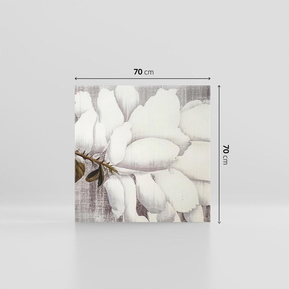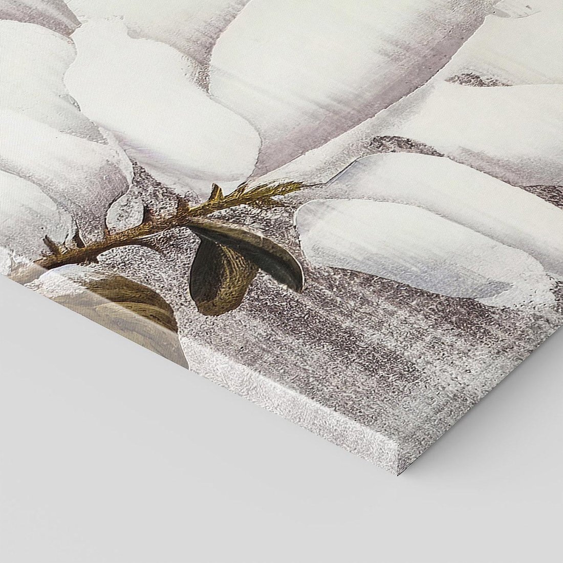 Ten wyjątkowy "obraz na płótnie" prezentuje białe kwiaty o dużych płatkach, ukazane na delikatnym szarym tle. Kanwa, na której malowano ten kwiatowy motyw, dodaje tekstury i głębi dziełu, nadając mu unikalnego charakteru. To elegancka dekoracja, która wzbogaci Twoje wnętrze o subtelny akcent natury i estetyki.