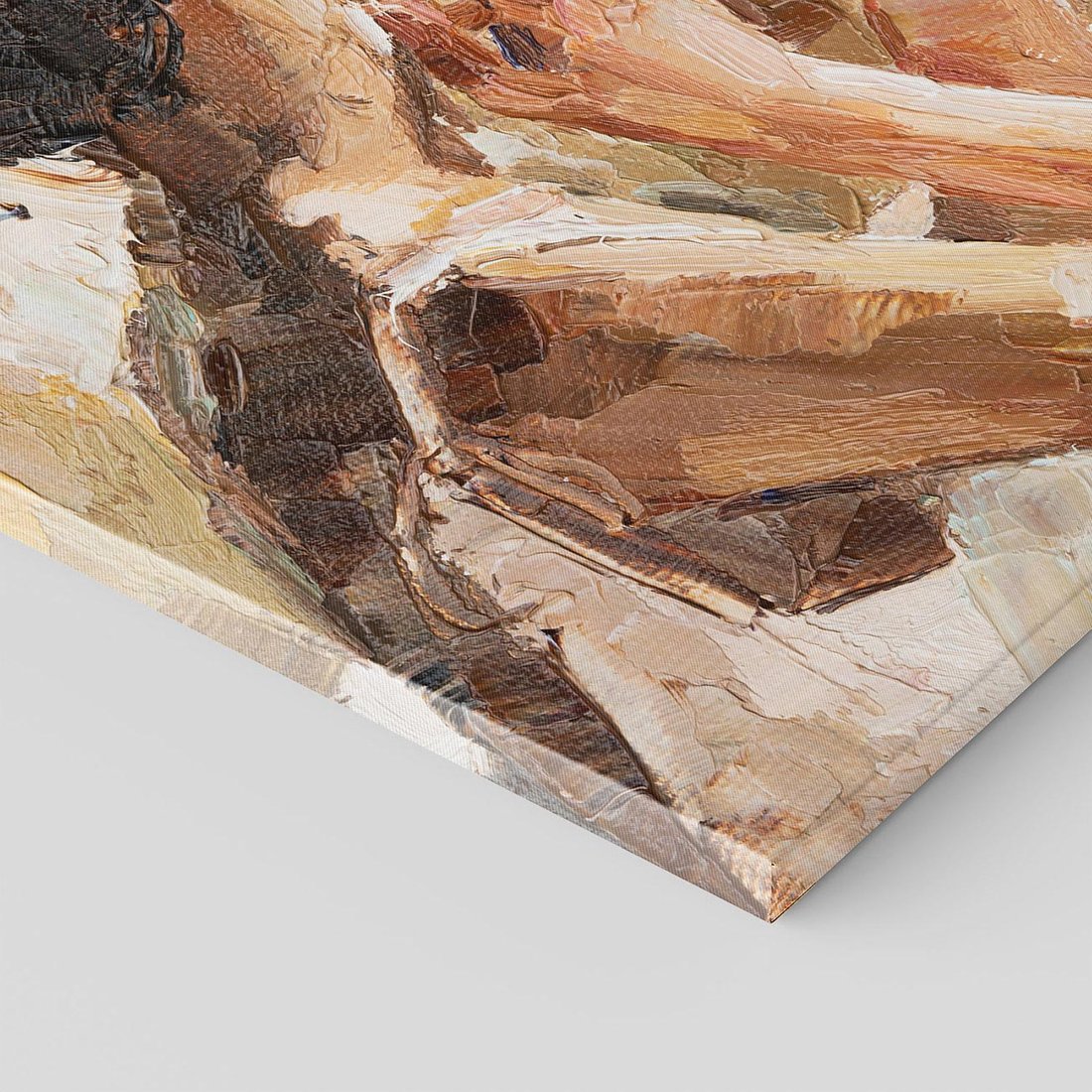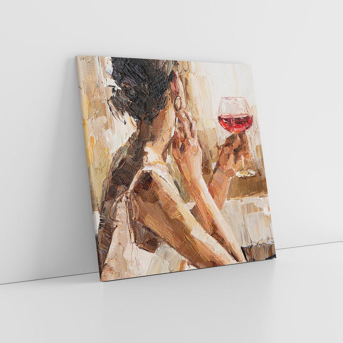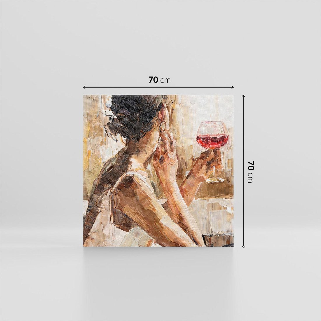 Abstrakcyjny portret tej tajemniczej kobiety ukazuje jej zmysłowy urok i elegancję. W tle widzimy kieliszek wina, który symbolizuje jej pasję do życia i radość bycia sobą. Obraz olejny w stylu impresjonizmu zdobi przestrzeń mocnymi pociągnięciami pędzla, które nadają mu unikalny, emocjonalny charakter.