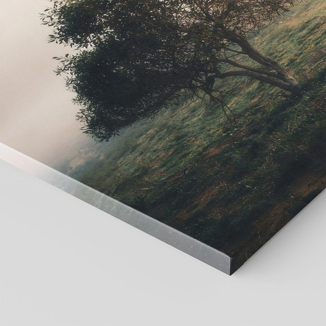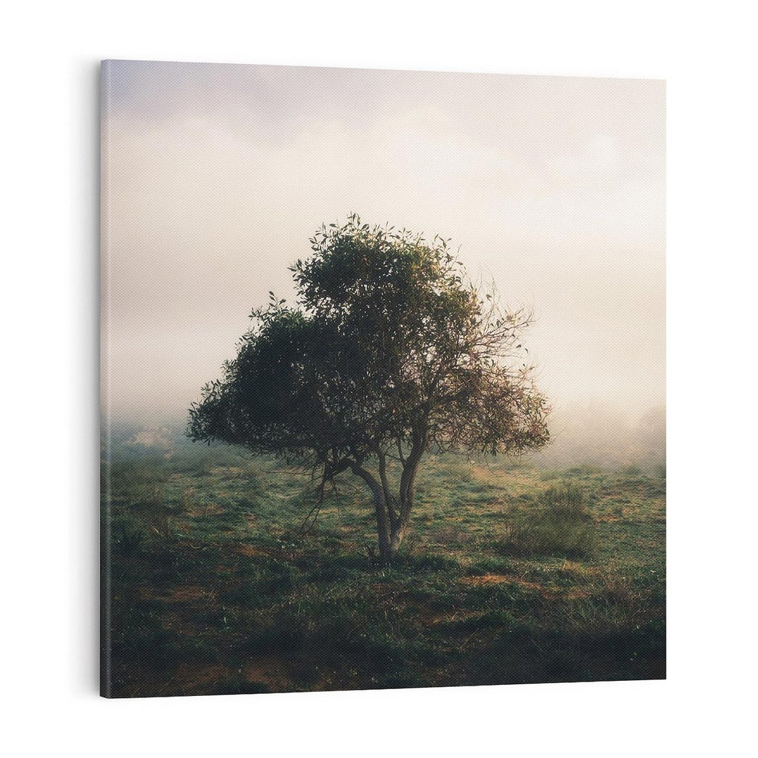 Obraz na płótnie 70x70 - Zamglona Prostota - artystyczna fotografia, samotne drzewo na zamglonej łące