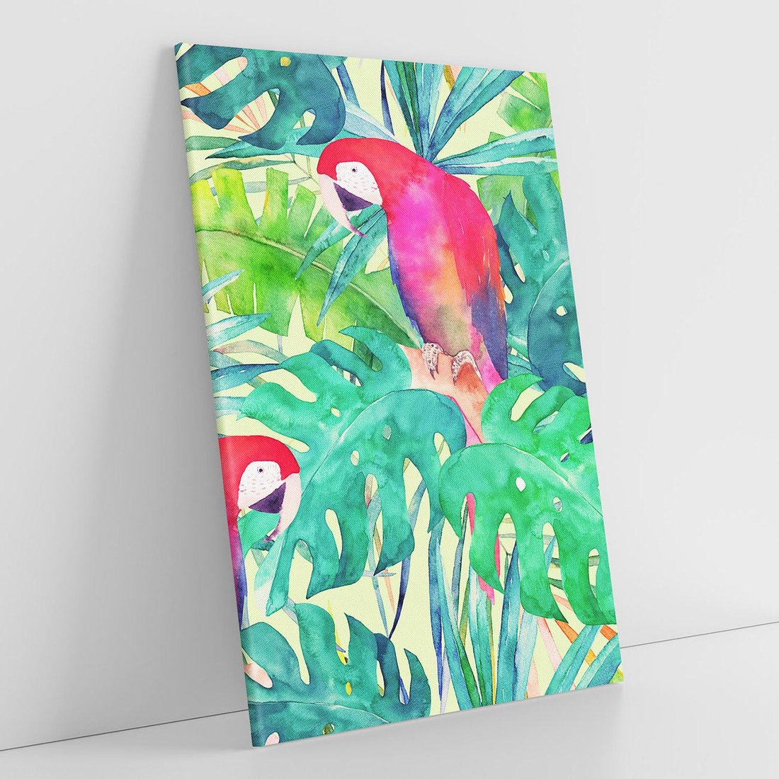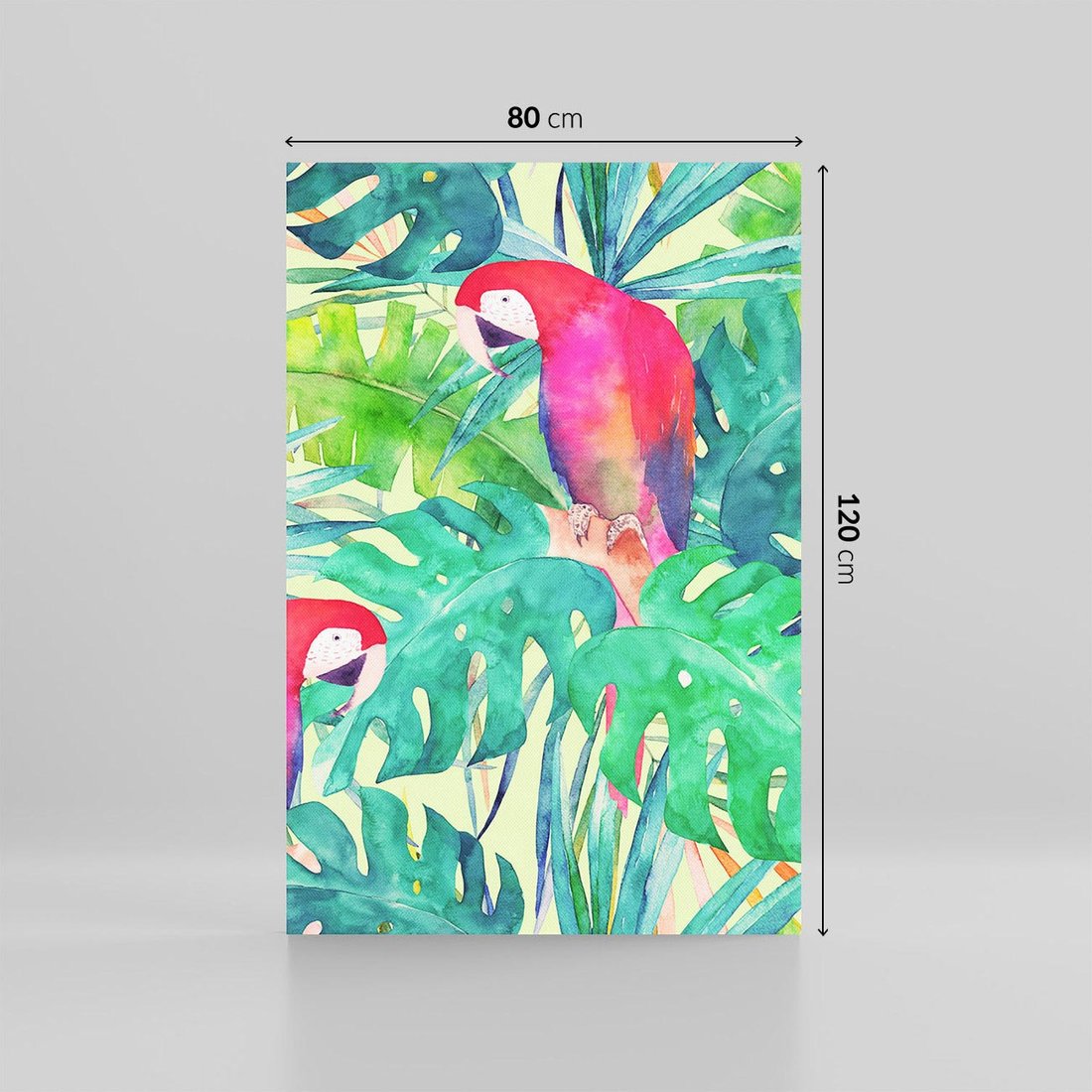 Ta egzotyczna kompozycja przedstawiająca tropikalne liście i papugi wprowadzi do Twojego wnętrza atmosferę egzotycznej przygody i kolorowego świata natury. Odkryj bogactwo kształtów i intensywność barw. Dodaj tropikalnego uroku i wyrazistości do swojego wnętrza.