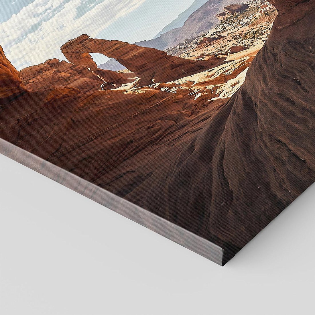 Ten obraz na płótnie przedstawia pejzaż pustynnego kanionu, emanującego tajemniczością i majestatem natury. Jego piękne odcienie i kontrasty tworzą atmosferę podróży i odkrywania. Doskonały wybór dla miłośników pejzażowych motywów i egzotycznego uroku.