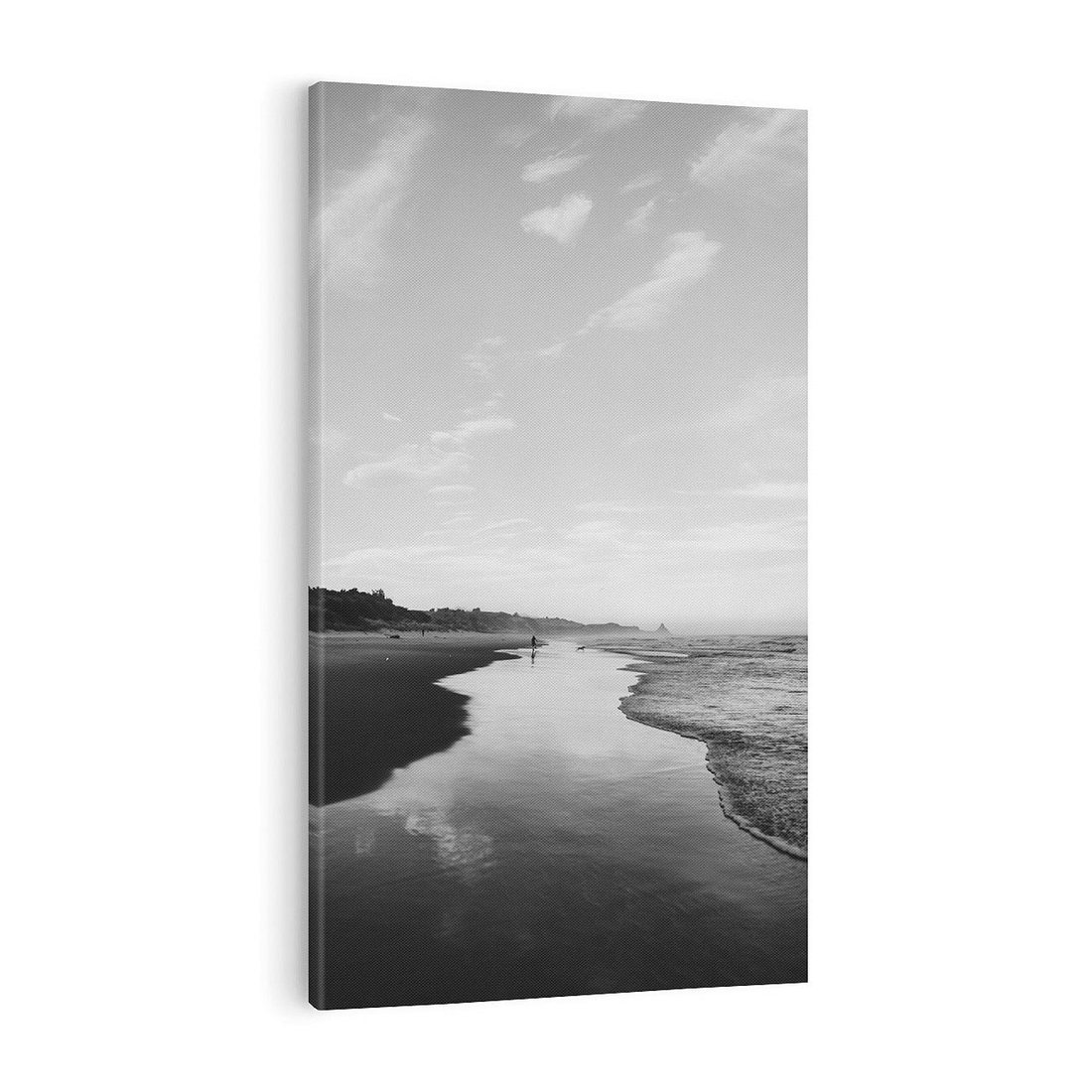 To czarno-białe zdjęcie oddaje urok nadmorskiego klimatu. Widok plaży i morza, utrwalony w monochromatycznej tonacji, nadaje temu obrazowi nostalgii i atmosfery spokoju. To idealna dekoracja dla tych, którzy kochają nadmorskie widoki i chcą przenieść kawałek plażowej atmosfery do swojego wnętrza.