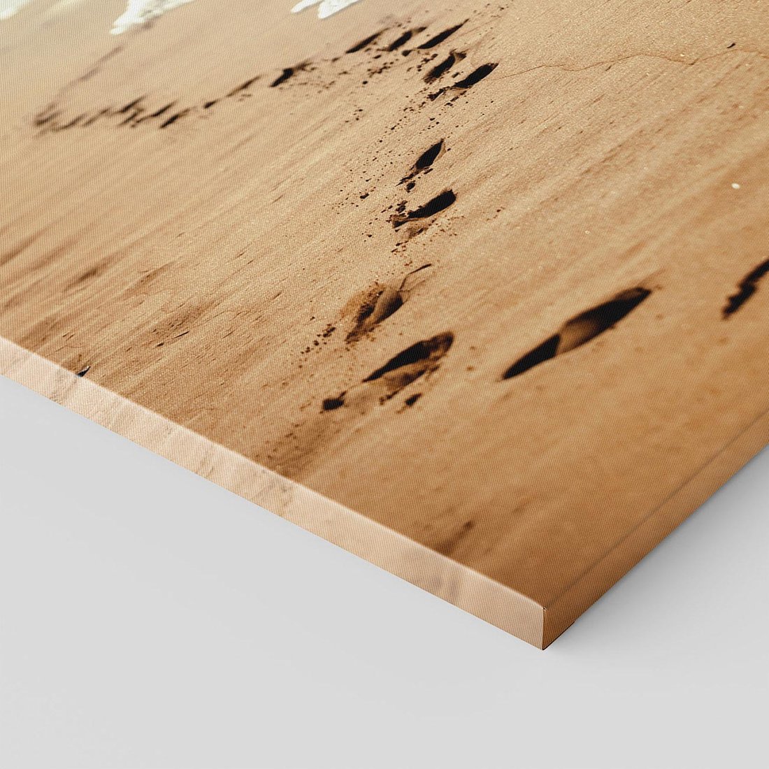 Ten ujmujący obraz na płótnie przedstawia pięknie piaszczystą plażę, na której widoczne są ślady stóp, świadectwo niezapomnianych chwil spędzonych na brzegu morza.